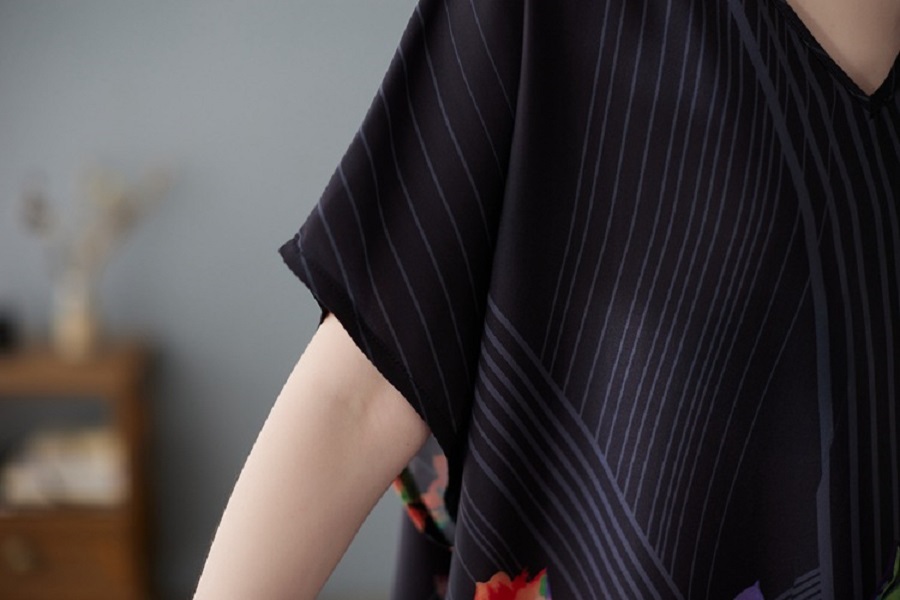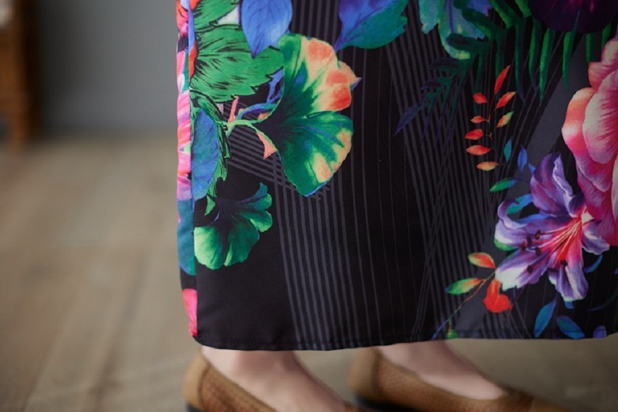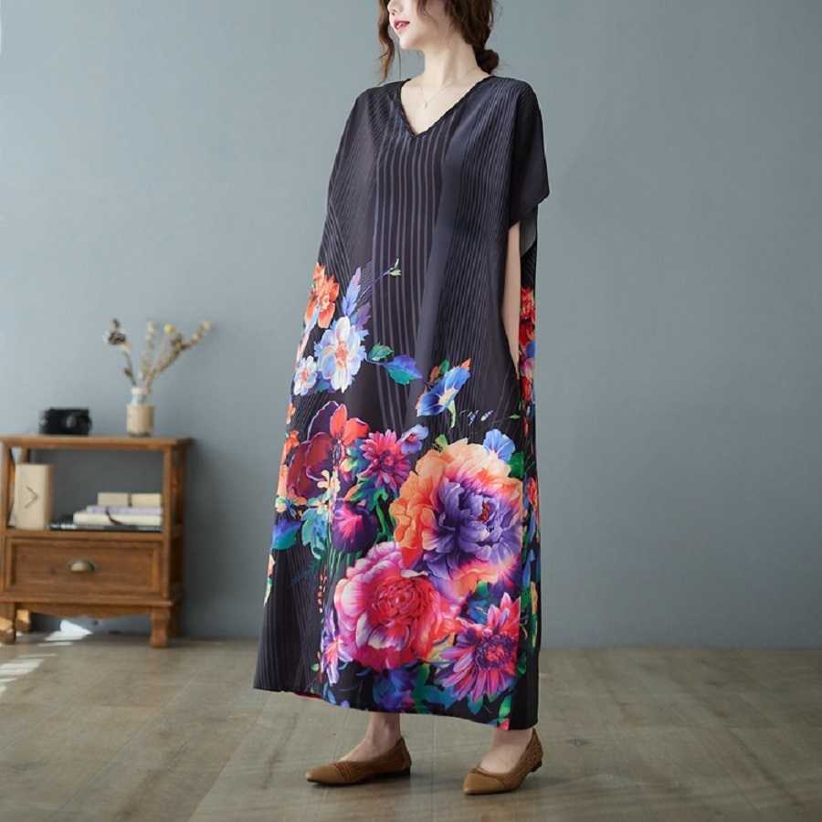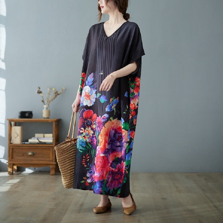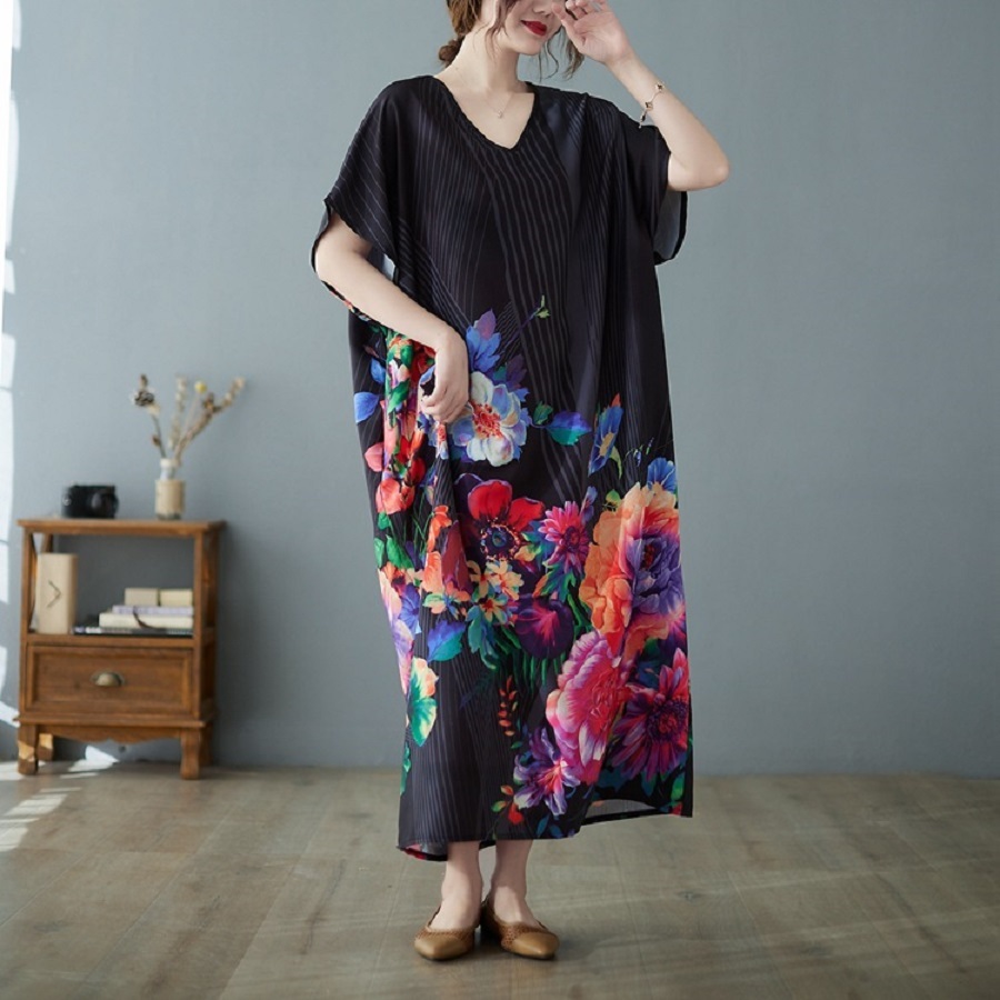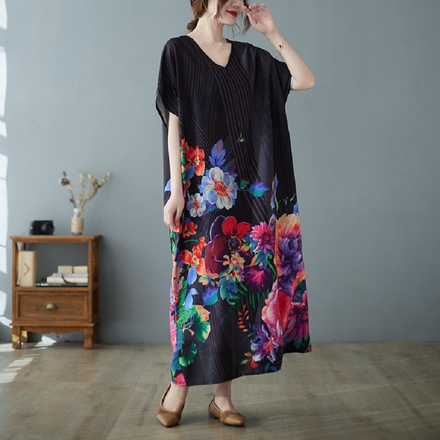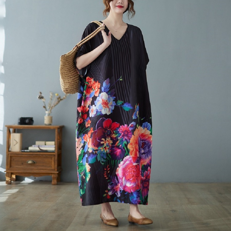 同梱1万円送料無料色鮮やかな和柄がおしゃれてろんとした素材のロング丈ワンピ★新品★大きいサイズ★ ゆったりVネックマキシ丈ワンピ
