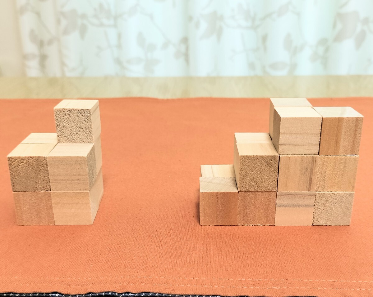 積み木は2cm四方のもので、小学校受験において頻出である四方観察や積み木の数に関する問題の家庭用教具になります。