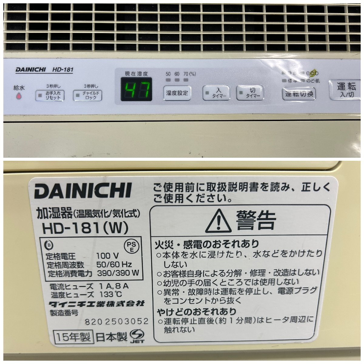 【中古品】DAINICHI ダイニチ工業 ハイブリッド式 加湿器 HD-181((W) ホワイト 温風気化 気化式 2015年製 木造30畳 コンクリート50畳