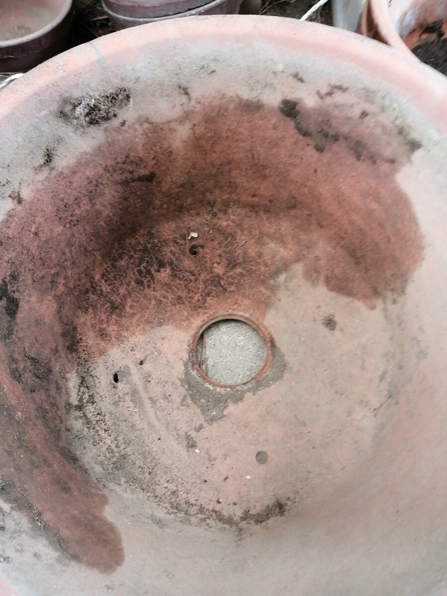 テラコッタ植木鉢 保湿性の良いタイプの素焼き鉢で乾燥させていますが、まだ土が取りきれていません。