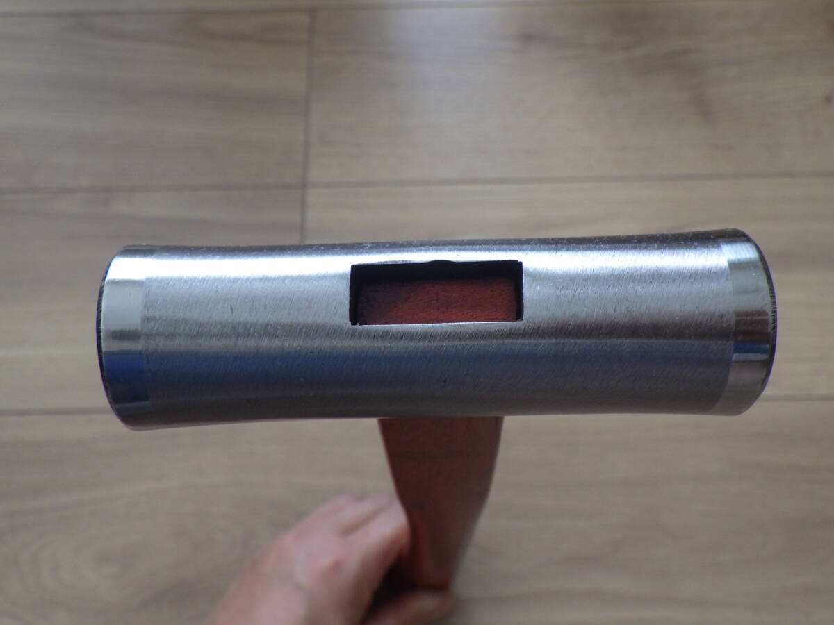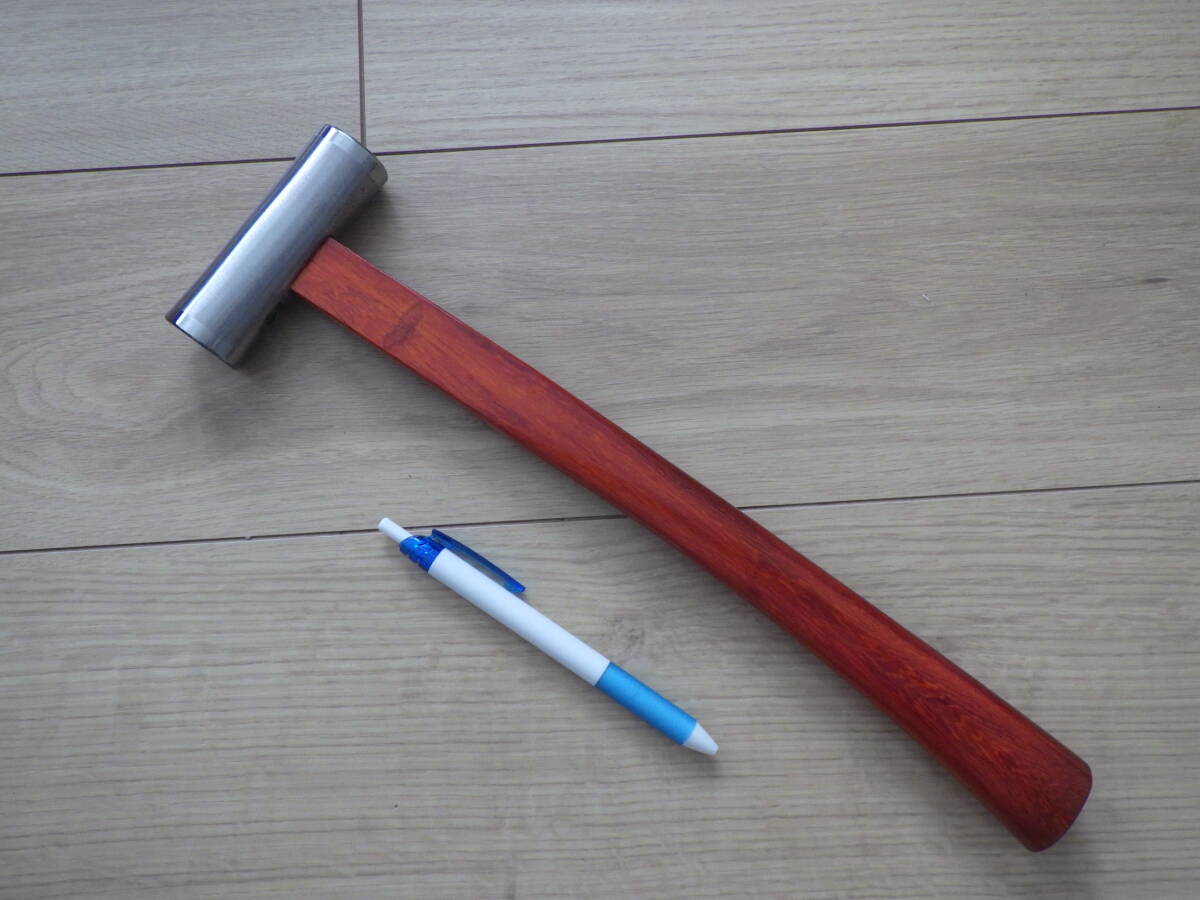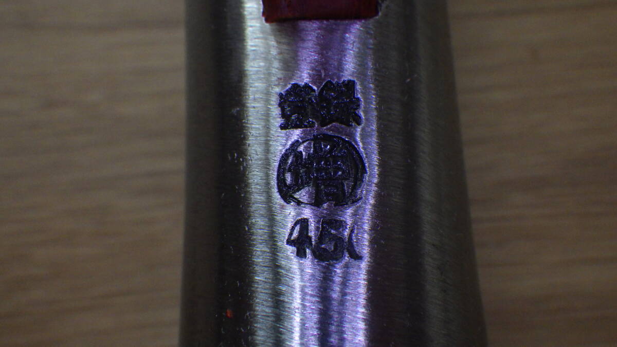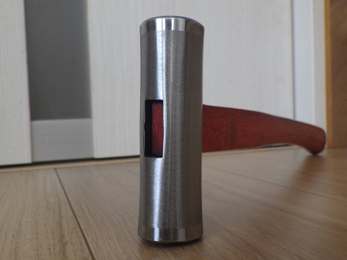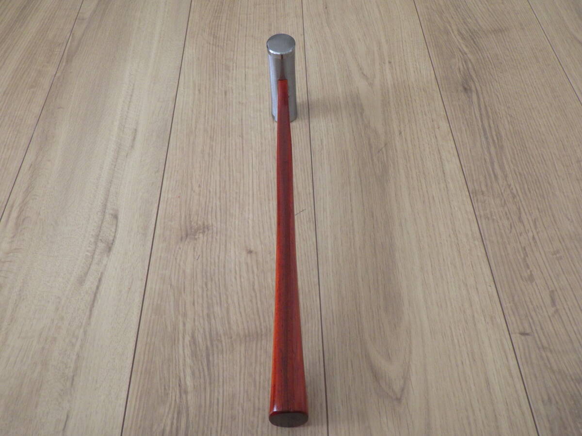紫檀柄は新たに製作した物です。全体の形状はわずかに曲がり柄で握り部分の断面は逆おにぎり型、柄尻を太め(縦3.5㎝横最大2.7㎝)に成形してあります。玄能の柄は櫃穴の8割以上固く仕込めば楔は必要ないそうですが、こちらの柄も8割程まで固く仕込みましたので、楔は打っておりません。ゆるみが出た場合は増し締めをお願いします。(中古の楔を1本お付けしますので、適宜お使い下さい。)