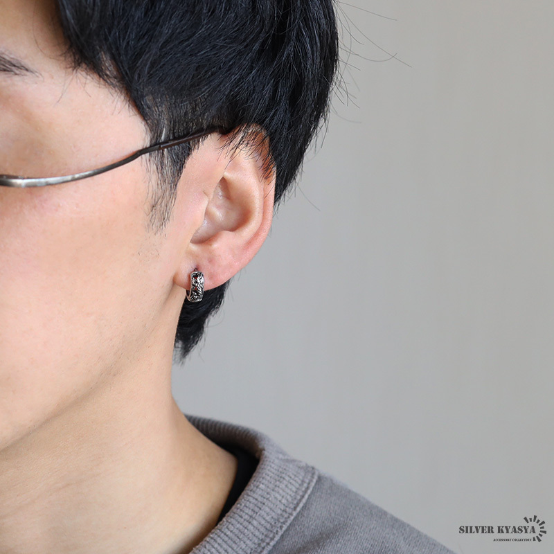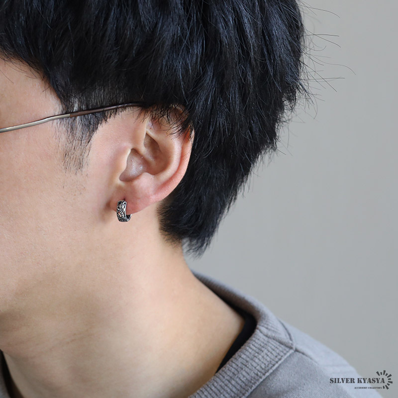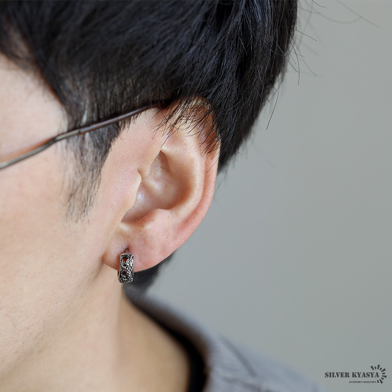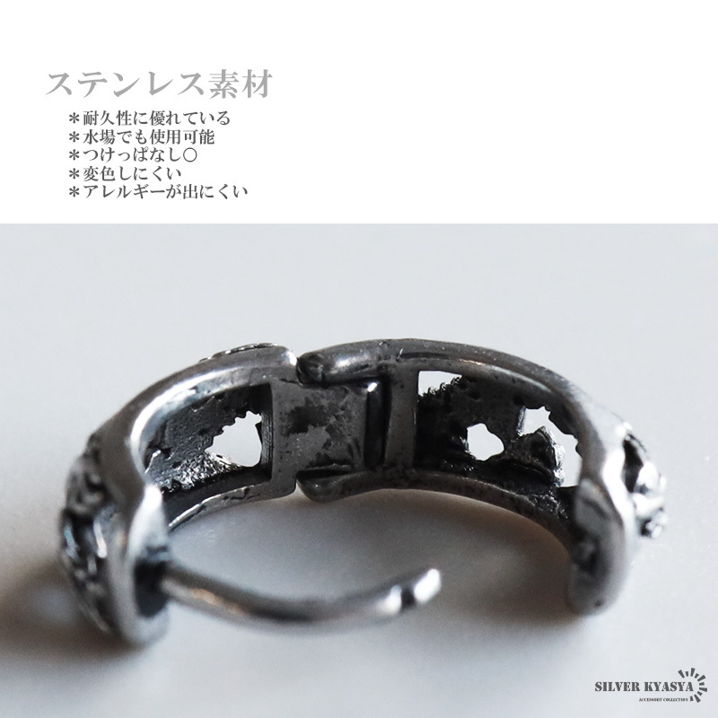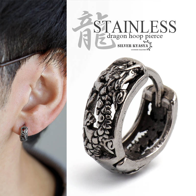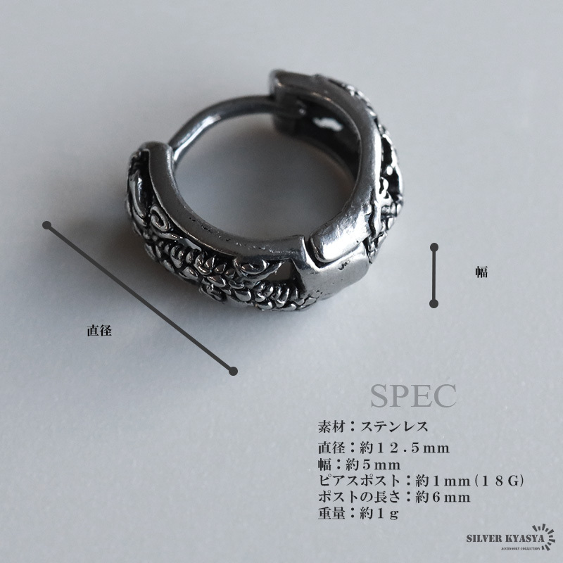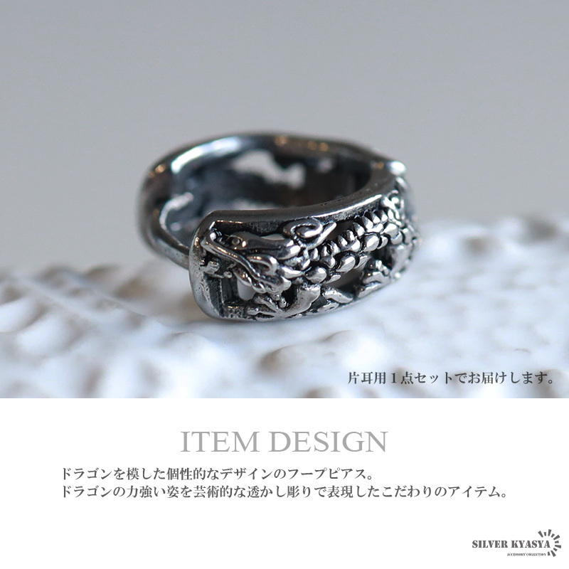 ステンレス素材 ドラゴン フープピアス 太め 透かし彫り シルバー 燻し風加工 アンティーク 金属アレルギーフリー 片耳