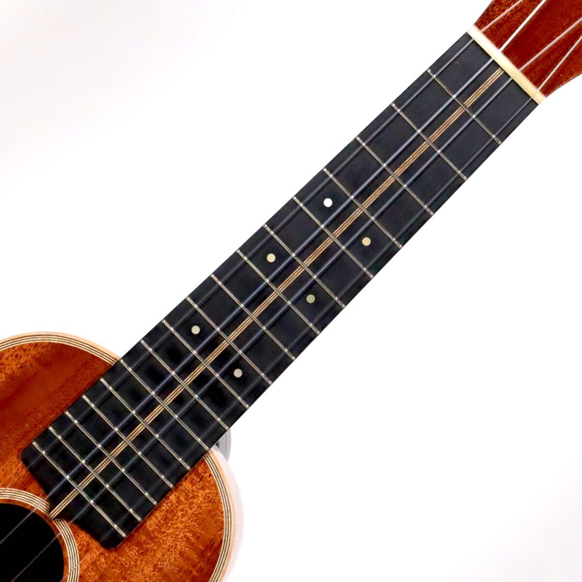 マーティン3Mは指板に3本の線が入っており、よく見かけるコピー品は指板表面に3本線の模様をはめているのに対し、本器は指板を7つのパーツに分け接着しています。