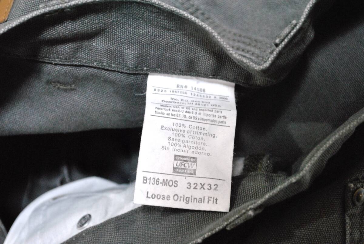 【CARHARTT】カーハート ダブルニーパンツ B136 MOS です。MADE IN USA。シルエットは太めのストレートです。厚手のコットン100%のダック生地です。カラーはMOS(グレーっぽい色)です。サイズはメンズW32です。未使用品の新古品(デッドストック)になります。(※ペーパータグは付属していません。一応、念の為に中古扱いとさせて頂きます) 元々カーハート特有のダメージ加工を施していますので、裾・ポケット口のダメージ・色落ち・色褪せなど着古した中古っぽい風合いに仕上がっています。古着(新古品)にご理解のない方、神経質な方の入札はご遠慮ください。慎重に検品しておりますが古着(新古品)の為、見落としがある場合がございます。何卒ご理解ください。入札、落札後のキャンセルはお断りします。ノークレームノーリターンでお願いします。尚、落札後のご連絡は翌日の昼12時以降になりますのでご了承ください。 (土日祝はお休みさせて頂きます。)