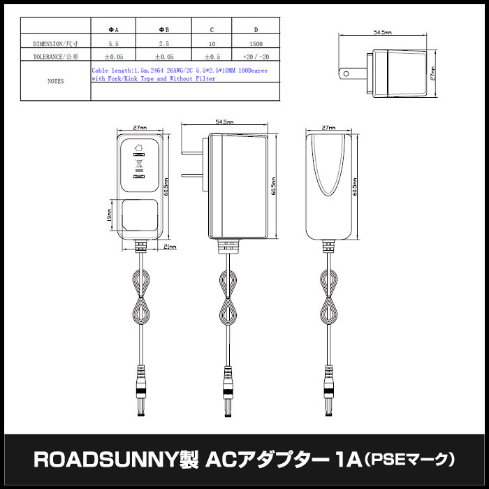 | 6401 ACアダプター 9V/1A/9W 5.5-2.5mm (RS-090100001) AC100~240V ROADSUNNY PSE/RoHS対応 安心の1年保証 | 1個 |