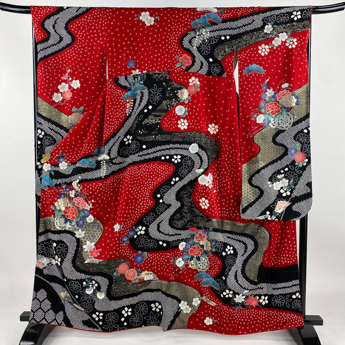 振袖 名品 花車 笠松 金銀彩 赤 袷 身丈162 裄丈66.5 M 正絹 【中古】 |