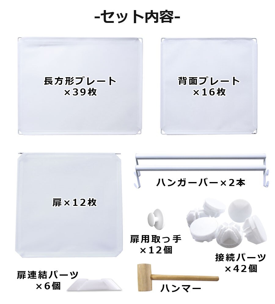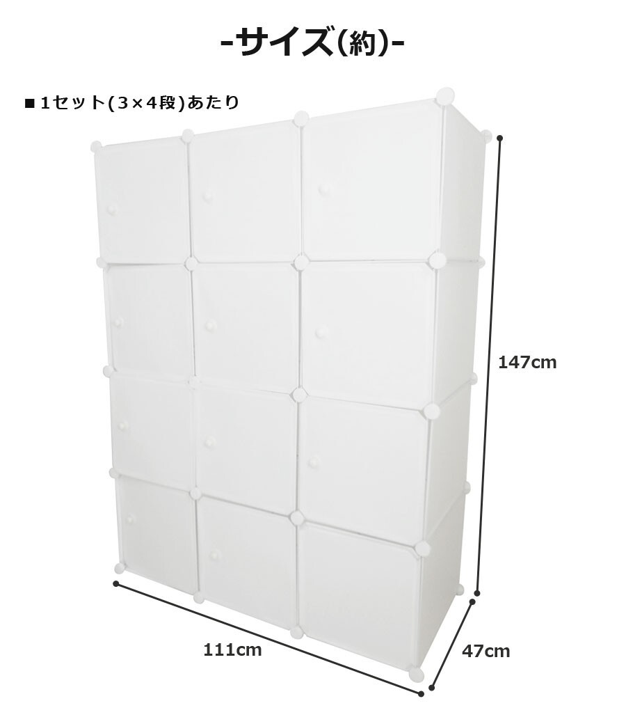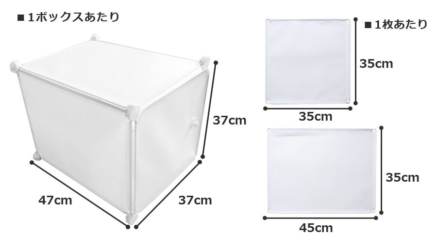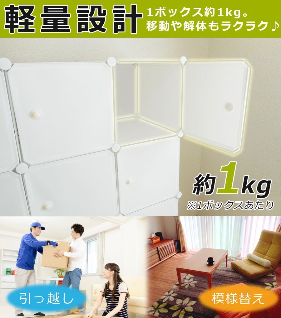 ![]() ![]() ■ブロックのようなシンプルなデザインで、すっきりと収納できる。 1セットで12ボックス分まで組み立て可能。一人分の衣類がまとめて入る 大型クローゼットに。 ![]() ■設置場所の環境やスペースに合わせて、ボックスのレイアウトを自由自在に変更可能。 1ボックスだけでも使えるので、すき間収納やスポット収納にも便利。 ■シンプルなデザインで衣類収納以外にもさまざまな用途で使える。台所であふれがちな調味料や食材、散らかりがちなおもちゃなどの収納に。 また、フィギュアや観葉植物などのディスプレイラックとしても活躍! ![]() ■重量は1ボックスあたり1kgと軽量なので、お部屋の模様替えやレイアウトを変える際も、組み立てた状態で簡単に移動することが出来ます。引っ越しや使わなくなった際は分解してしまえるのでお部屋からの運び出しもラクラク。 ![]() ![]() | ||||||||||||||