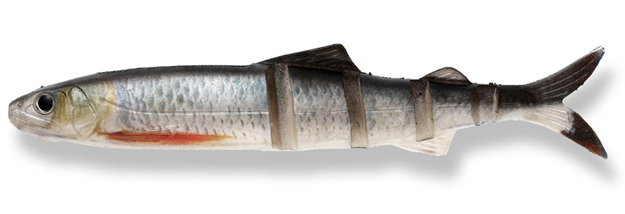 最大の特徴は縦方向にセットされたリアテール。 オリジナルジャバロンに比べアクション自体は小さくなりますが、 細かくタイトなシェビーアクションに変化するため、 「より本物に近いリアルさ」という面では 圧倒的にスーパーリアルがアドバンテージを持ちます。小さくクイックなアクションで 本物のベイトフィッシュに近づけたジャバロンスーパーリアル。もちろんジャバロンの遺伝子を受け継いでいるため、ノーシンカー、テキサス、ダウンショットリグ、 ネイルリグ、ジグヘッドリグ、ヘビーキャロライナリグ等、あらゆるリグに対応する万能ルアーです。