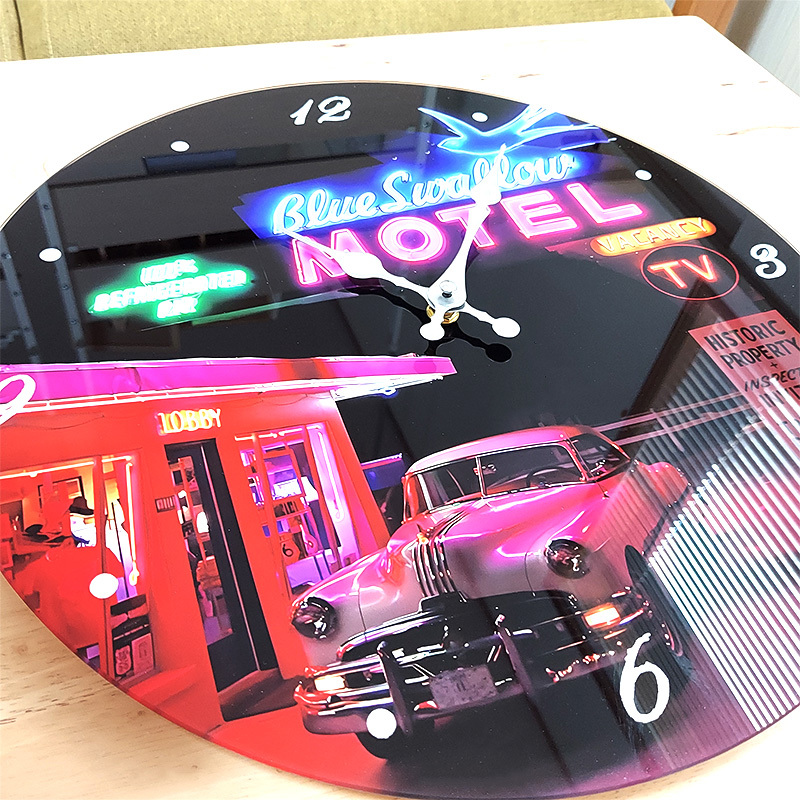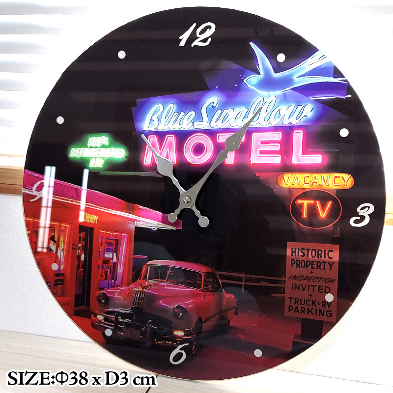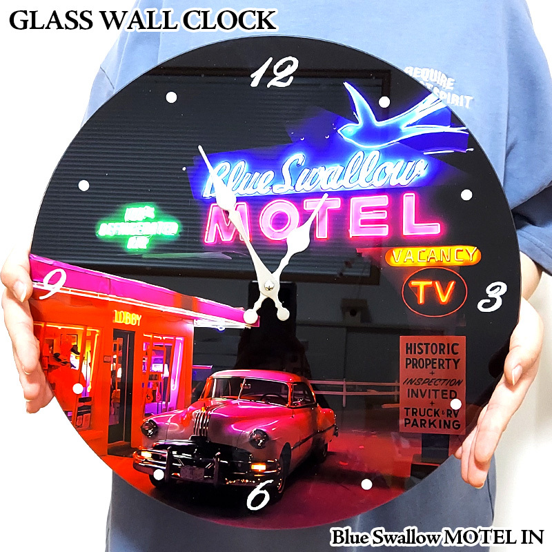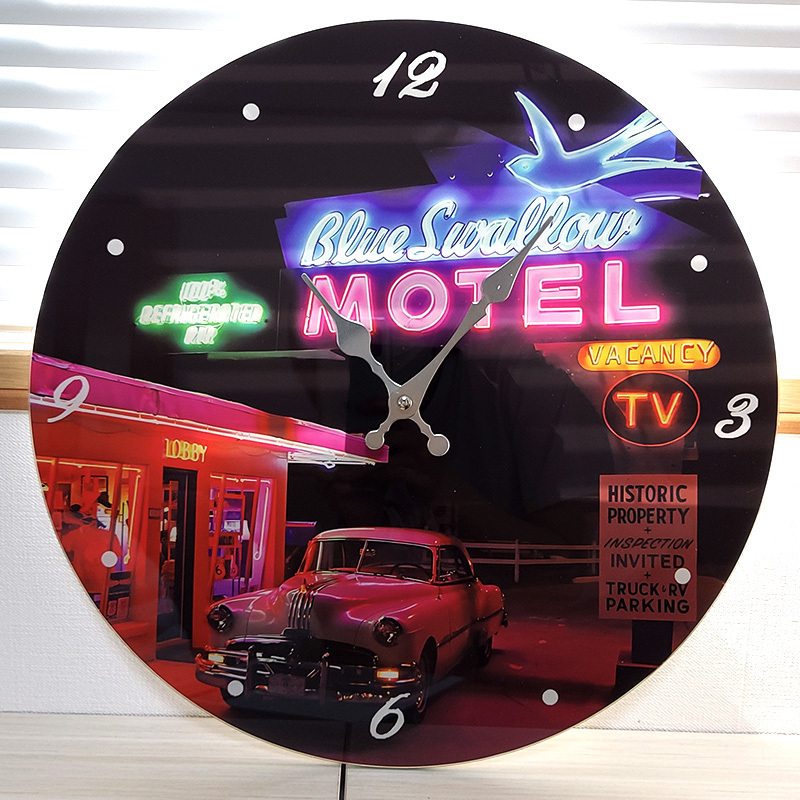 商品説明 | 「ガラスウォールクロック Blue Swallow MOTEL IN」 ガラスクロックにレトロな車と目を惹くモーテルの看板がデザインされたお洒落な掛け時計です。 いつものお部屋に飾るだけでアメリカンな雰囲気を演出してくれます。 背面には壁に取り付けられるフックがあります。 ※単三電池をお一つプレゼント☆彡届いたらすぐご使用頂けます。 お部屋はもちろん、カフェやバーなどお店のディスプレイにもおすすめです。 プレゼントにもいかがでしょうか? |