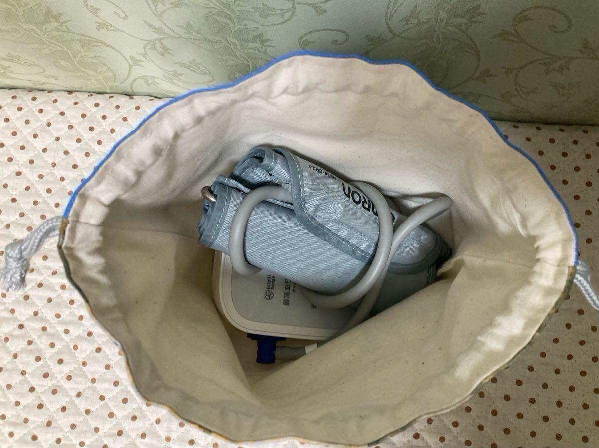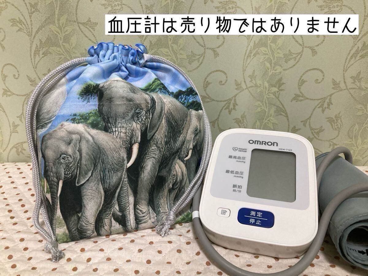 巾着 巾着袋 上腕式血圧計(置き型)サイズ 血圧計入れ 底板付(ボール紙) レア柄 ゾウ サイ ハンドメイド《血圧計は撮影用です》