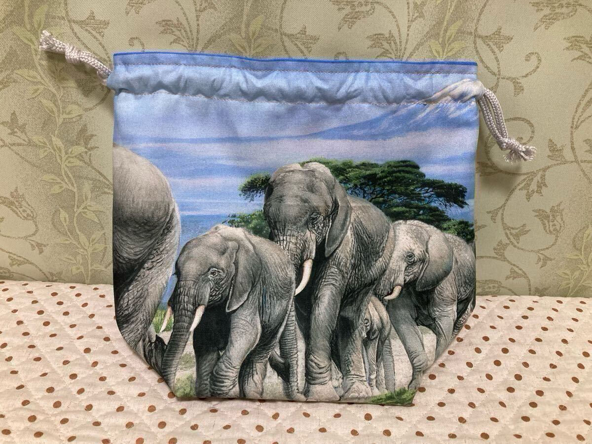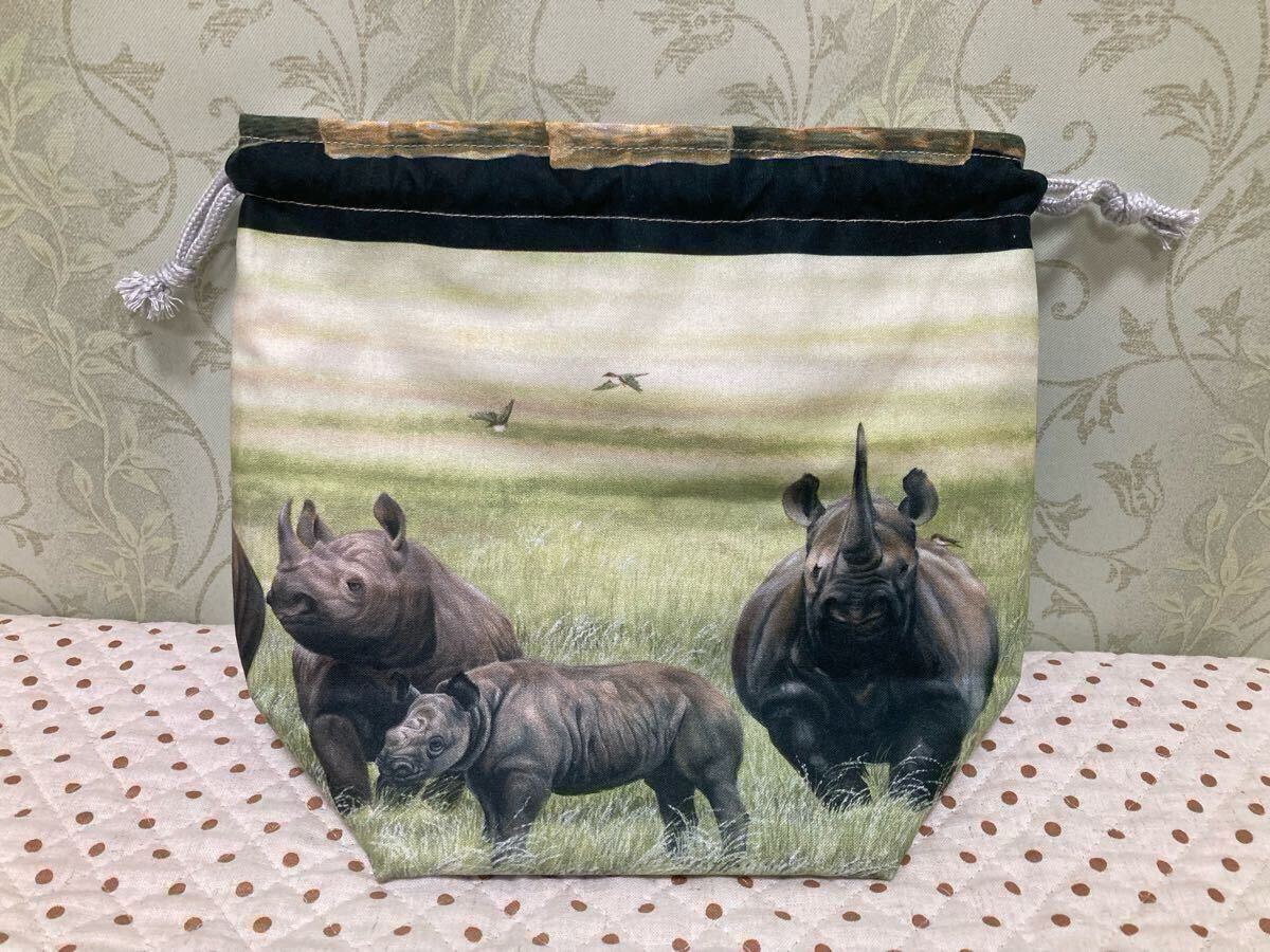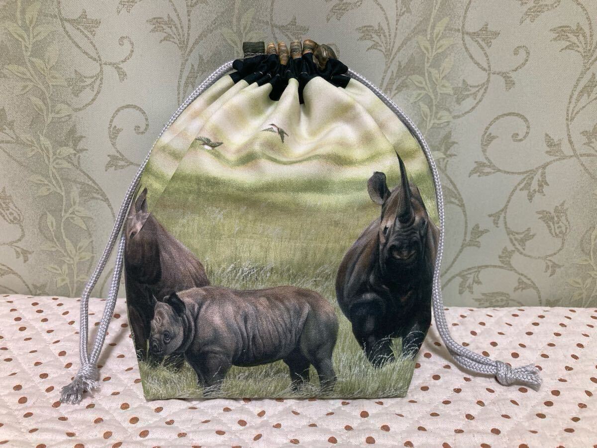 ゾウとサイの発色の良いデジタルプリント生地で作った巾着袋です(画像にモアレが生じる場合があります。拡大していただくと消失しますので、ご確認のほどよろしくお願いいたします)。