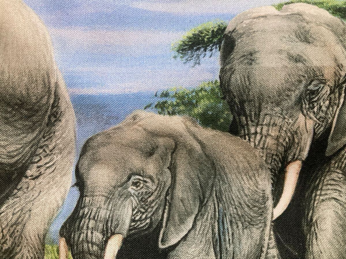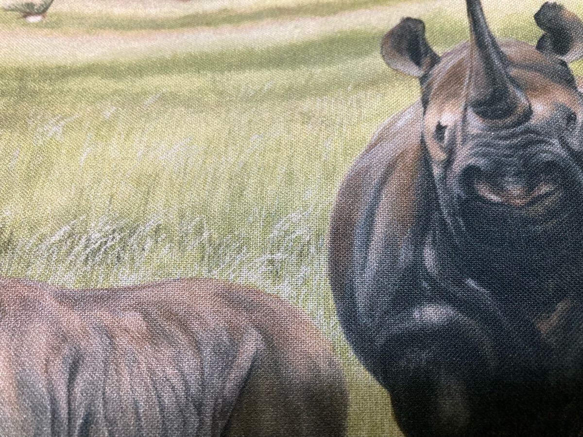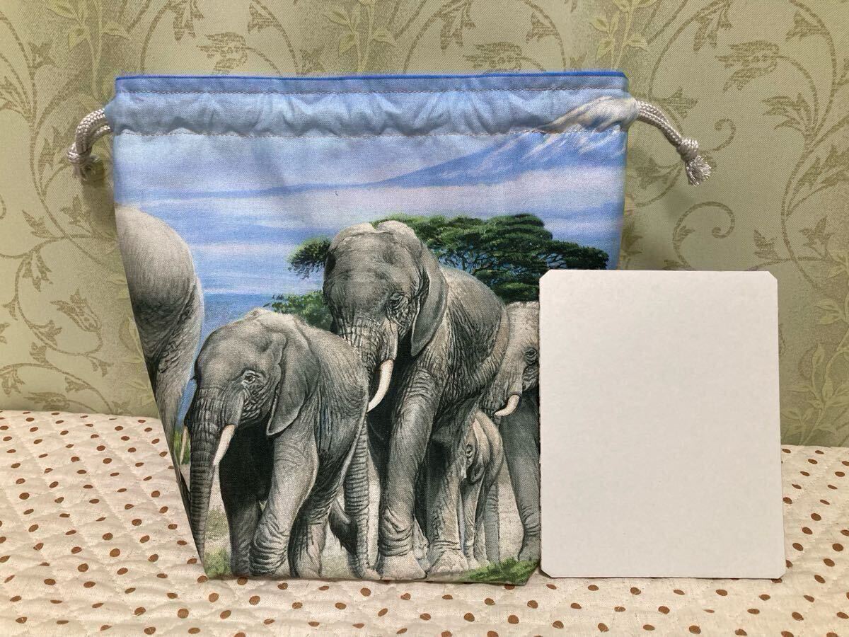 ゾウとサイの発色の良いデジタルプリント生地で作った巾着袋です(画像にモアレが生じる場合があります。拡大していただくと消失しますので、ご確認のほどよろしくお願いいたします)。