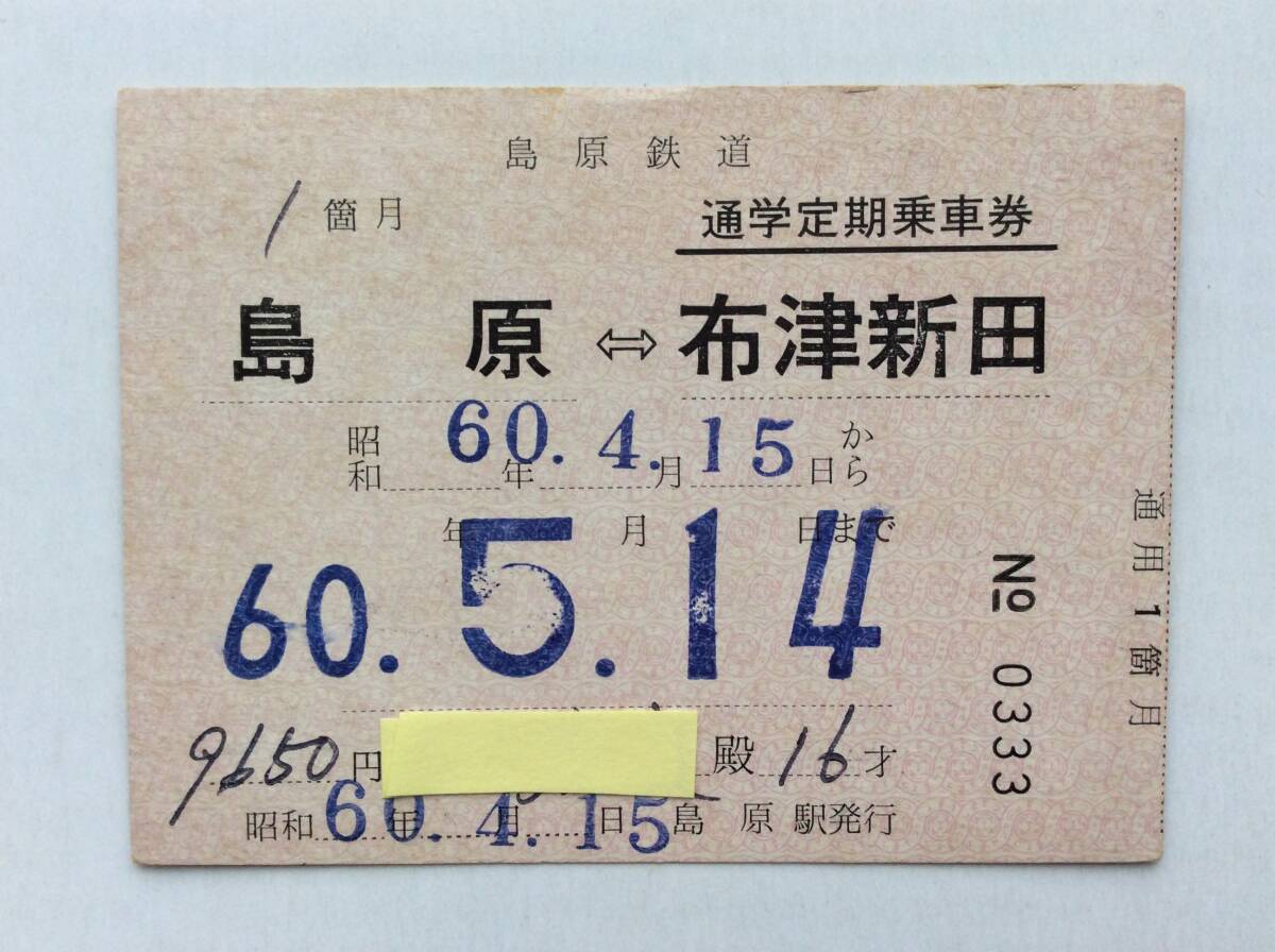 島原鉄道 通学定期乗車券 常備 島原ー布津新田 昭和60年