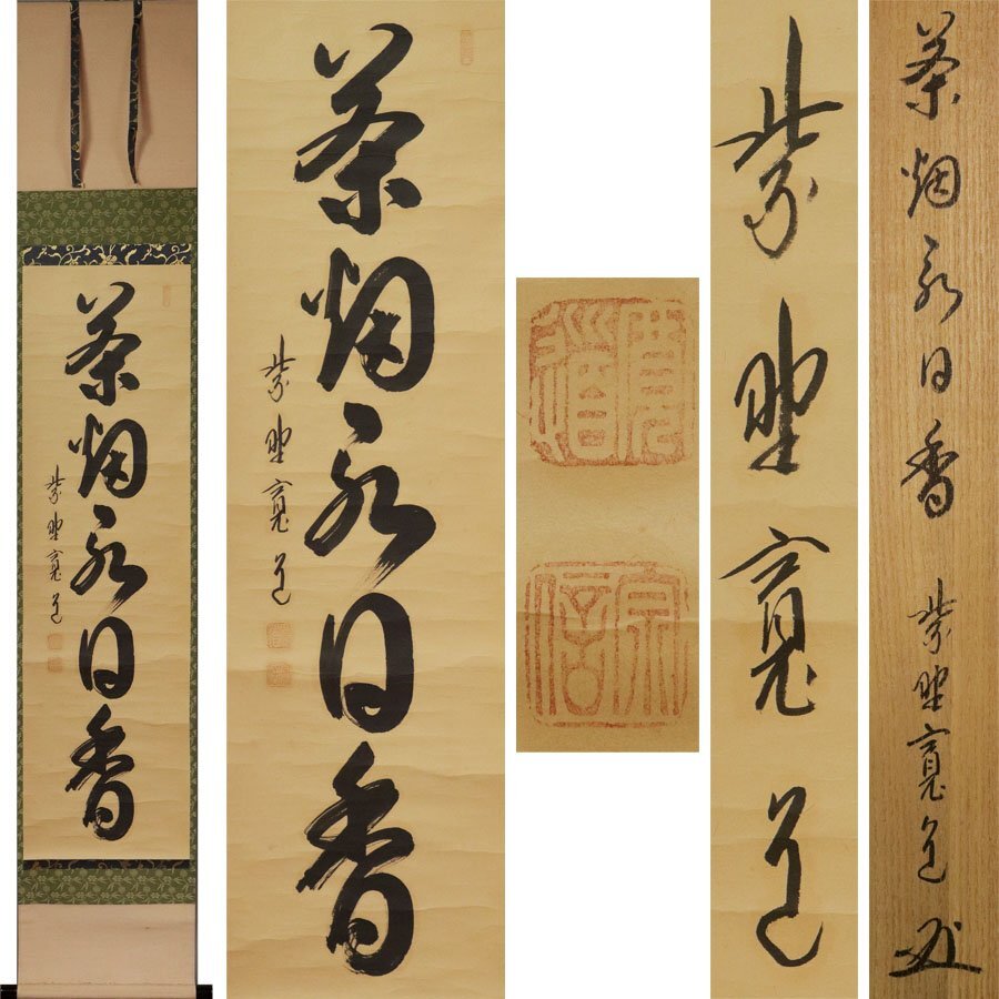 ■商品説明 下記、大徳寺雲林院の住職である藤田寛道の手によって、 「茶烟永日香」と綴られた茶掛け一行書の作品です。 力強い筆遣いが独特の味わい深さを見せております。 【 茶烟永日香(さえん えいじつにかんばし) 】 お茶を沸かす時の煙が、春のうららかな日に香ばしく立ち上がる のどかで静かな情景を表現しております。 《 藤田寛道 》 1926年~1985年。 寛道宗信。大徳寺雲林院住職。 大正15年 京都市に生まれる。 昭和41年 大徳寺大光院 小堀明堂に就いて得度。 大徳寺僧堂に掛塔 小田雪窓に参禅。 雪窓遷化後は方谷浩明に就いて修行する。 昭和44年 大徳寺大光院副住職。 昭和49年 大徳寺雲林院住職に就任。 昭和52年 福岡県 崇福僧堂に再掛塔。 昭和55年 雲林院の修復に着手。 昭和57年 本山内局の書記に就任。 昭和58年 雲林院の修復完成。 昭和60年 遷化60歳。 ■紙本・肉筆 ■状 態 時代なりのヤケ・オレ等が見られます。 ■寸 法 軸寸法/約168.0cm×約30.5cm。 本紙寸法/約 99.0cm×約27.5cm。 ■落 款 ご覧の様な銘・落款等あり。 ■箱 共箱。 【即決・送料無料】の表示商品に限り、 一部地域(北海道・沖縄)を除き、送料無料キャンペーンを実施しております。 ご希望の方は、お早めに入札して頂けます様、宜しくお願い致します。 【※※なお、作品に対して疑問や質問がある場合には、※※】 質問欄もしくは、ストア情報に当方の情報が記載されておりますので、こちらをクリックしてお問い合わせ下さい。 宜しくお願い致します。 |