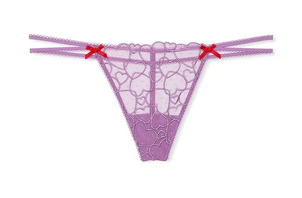 ・色:紫のドットのついたメッシュ地にハートの刺繍。フロント左右に赤のリボン。
