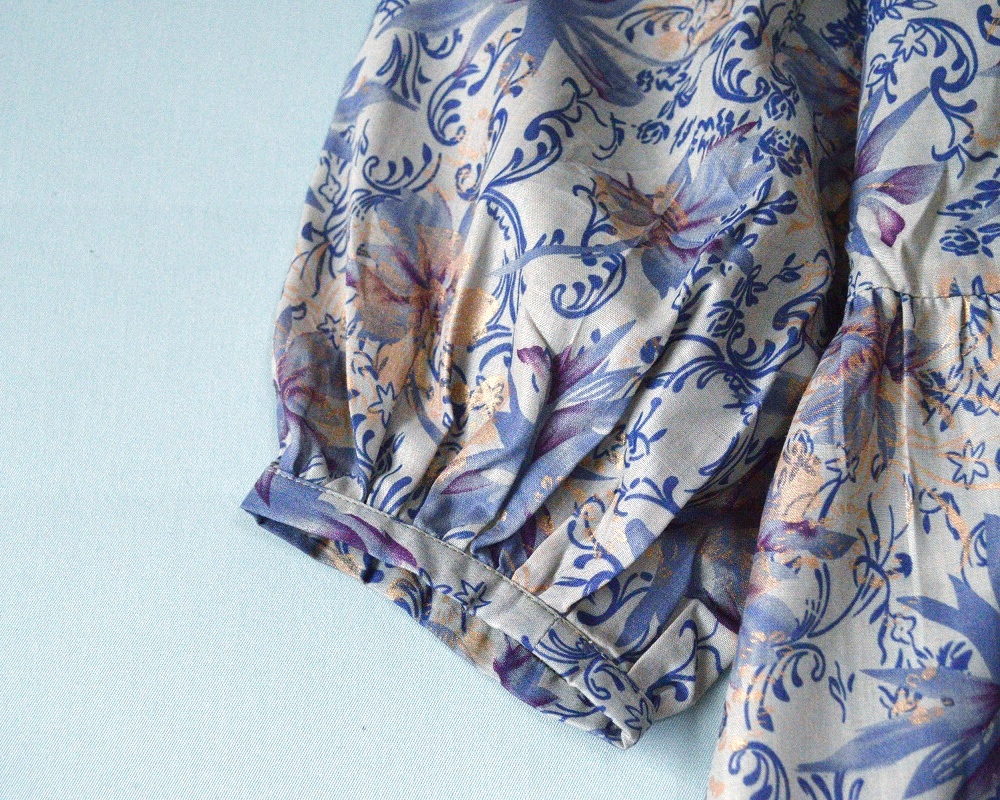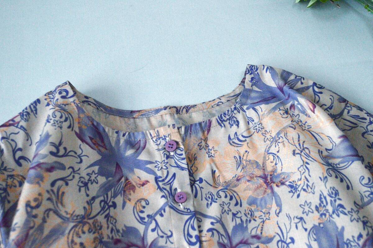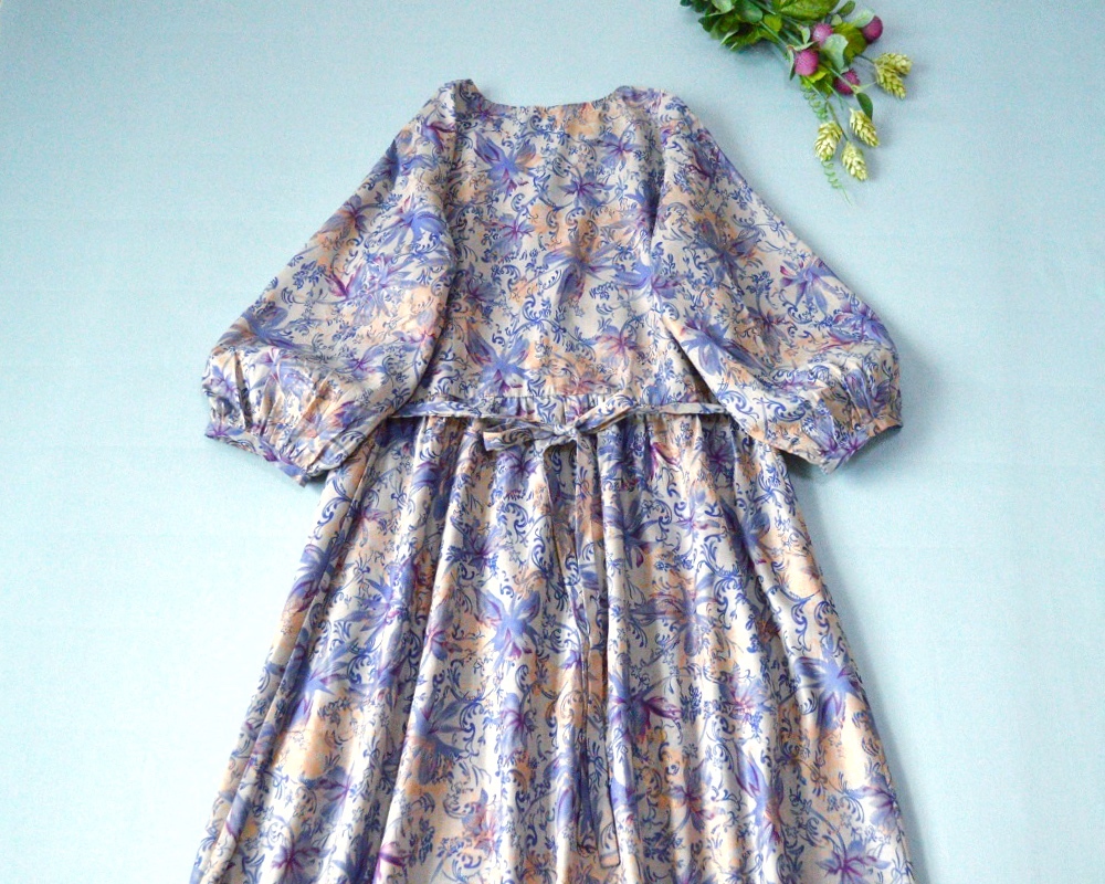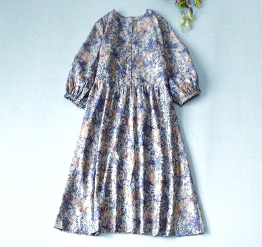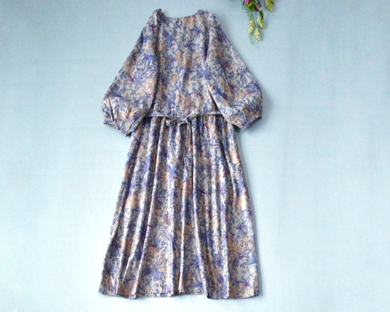 | ★,。・:*:.・ご覧下さりありがとうございます・:*:.・★,。 サイズは平置き採寸しています。 必ずサイズをお確かめ下さいませ。 (手作りですので、多少誤差があります、ご了承ください。) 着丈:105cm バスト:106cm(一周) 肩幅:38cm ウエスト:92cm(一周) 袖丈:44cm 袖口:24.5cm(一周) 素材: 表地:コットン100% 裏地無し カラー:紫プリント | ||