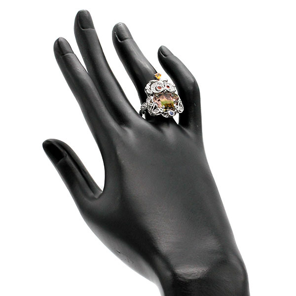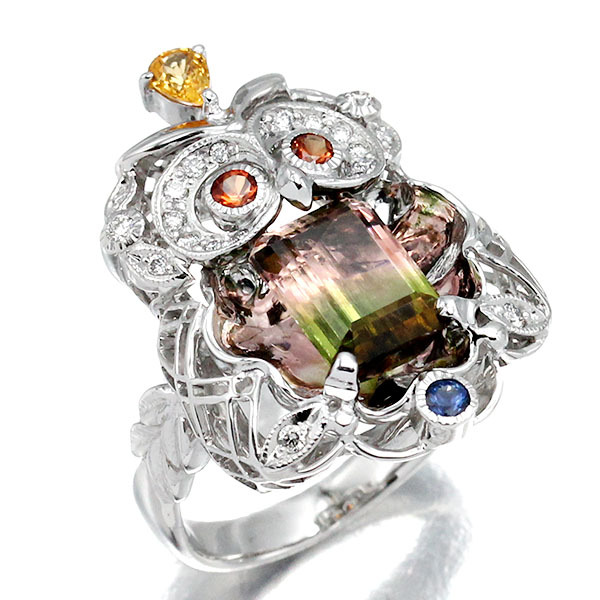 K18WG フクロウモチーフ バイカラートルマリン サファイア ダイヤモンド リング 14.5号 T3.27ct BS/OS/YS0.43ct D0.17ct 宝石 ジュエリー