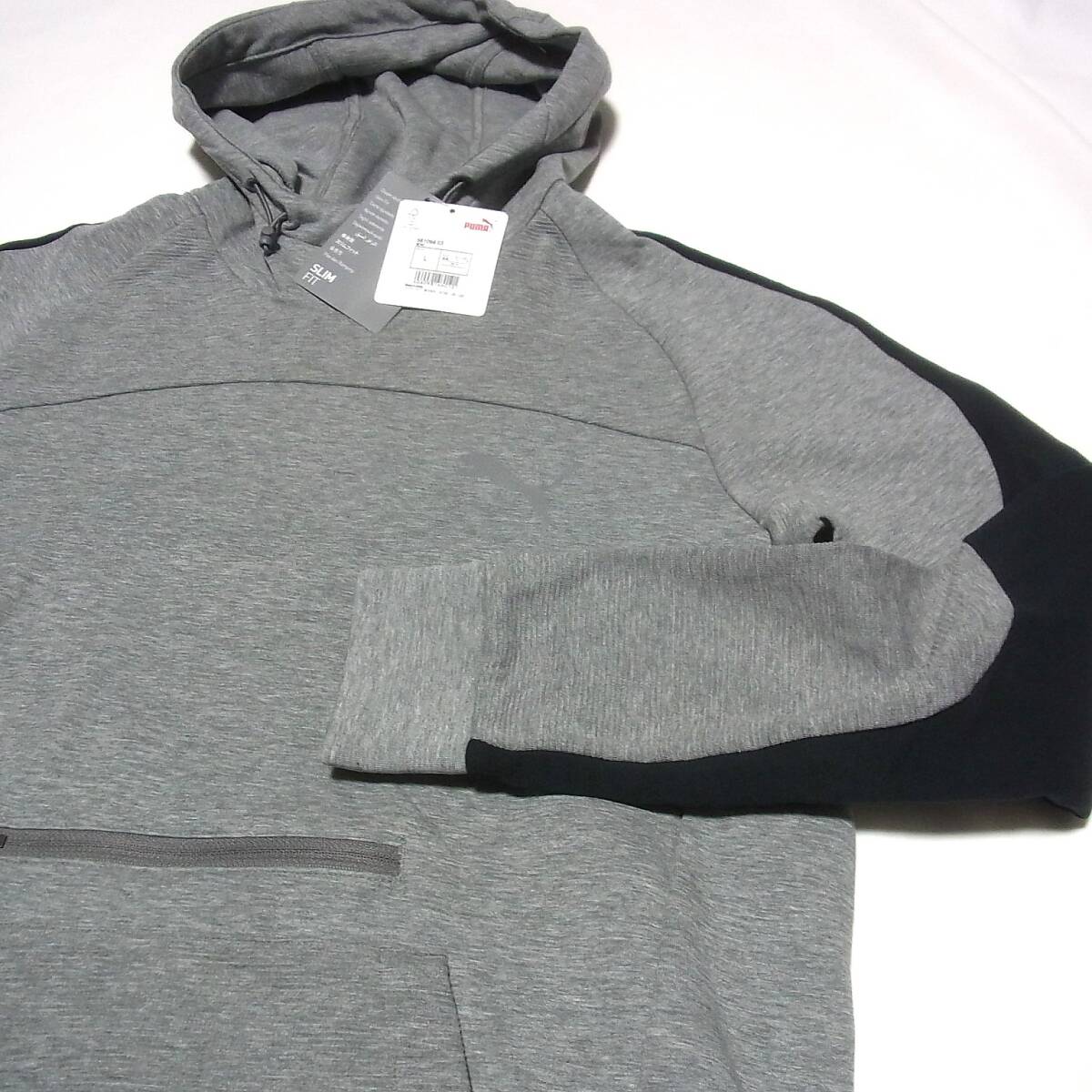PUMA 未使用 プーマ EVOSTRIPE フーディ パーカー L◎杢グレー 灰色 ポリエステル+綿のスウェット地 シンプルなデザイン