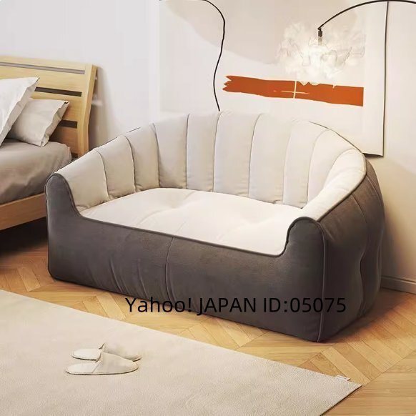 インスタ風の一人暮らし用小型アパートのリビングルームやベランダ、寝室に置ける二人用のラウンジソファ、タタミ、ビーンバッグ