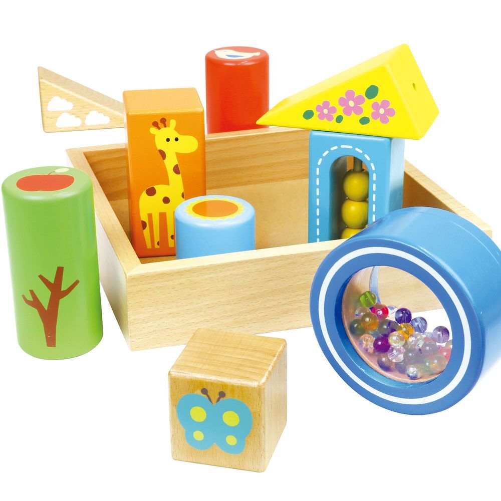 振ると音が鳴るかわいいつみきです。リンリン(鈴)、カラカラ(木玉)、シャカシャカ(ビーズ)と異なる3種類の音を楽しめ、聴覚を含めた多様な感覚を育むことができます。ビーズや木玉は動きが見えて視覚的にも楽しいものになっています。さらに基尺がそろっているため、並べたり積んだりする動作もスムーズです。初めてのおもちゃにも最適な大きめサイズで、小さな手にもぴったりフィットします。全てのパーツは面取り加工済みの角丸設計で、安心安全にお使いいただけます。木箱付きでパズル感覚でお片付けが楽しめます。ラッピング袋付きでギフトとしてもおすすめです。