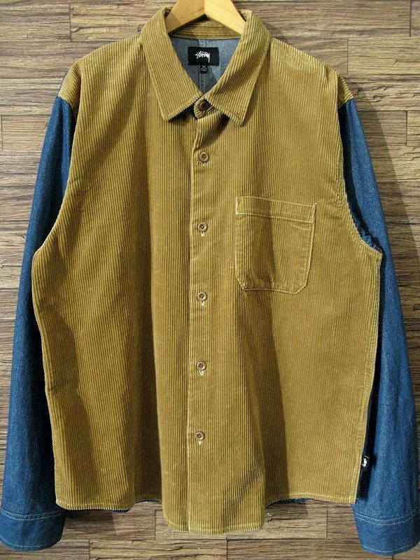 送無 美品 XL 定23,100 20AW Stussy ステューシー Cord Denim Mix Shirt 長袖 太畝 コーデュロイ 切替 デニム シャツ ベージュ/インディゴ