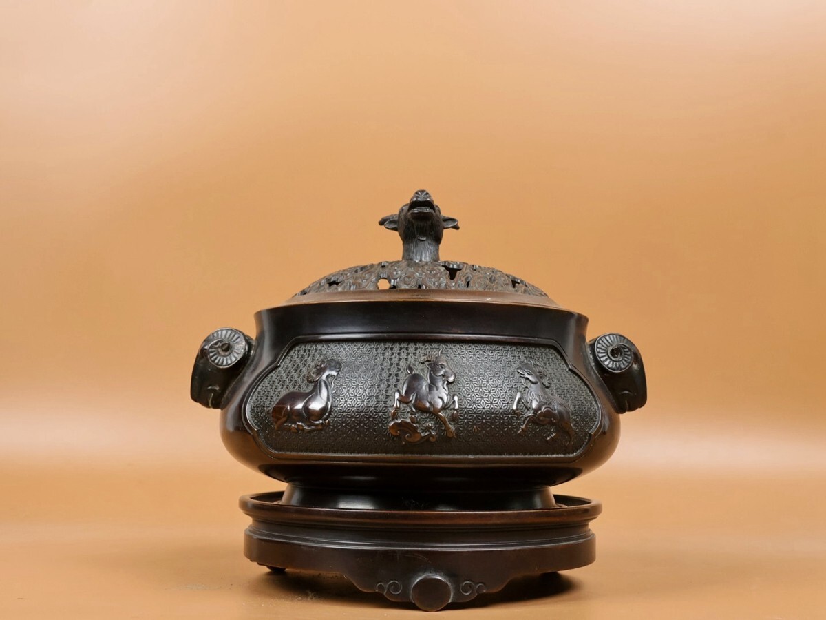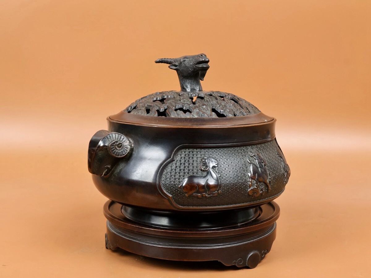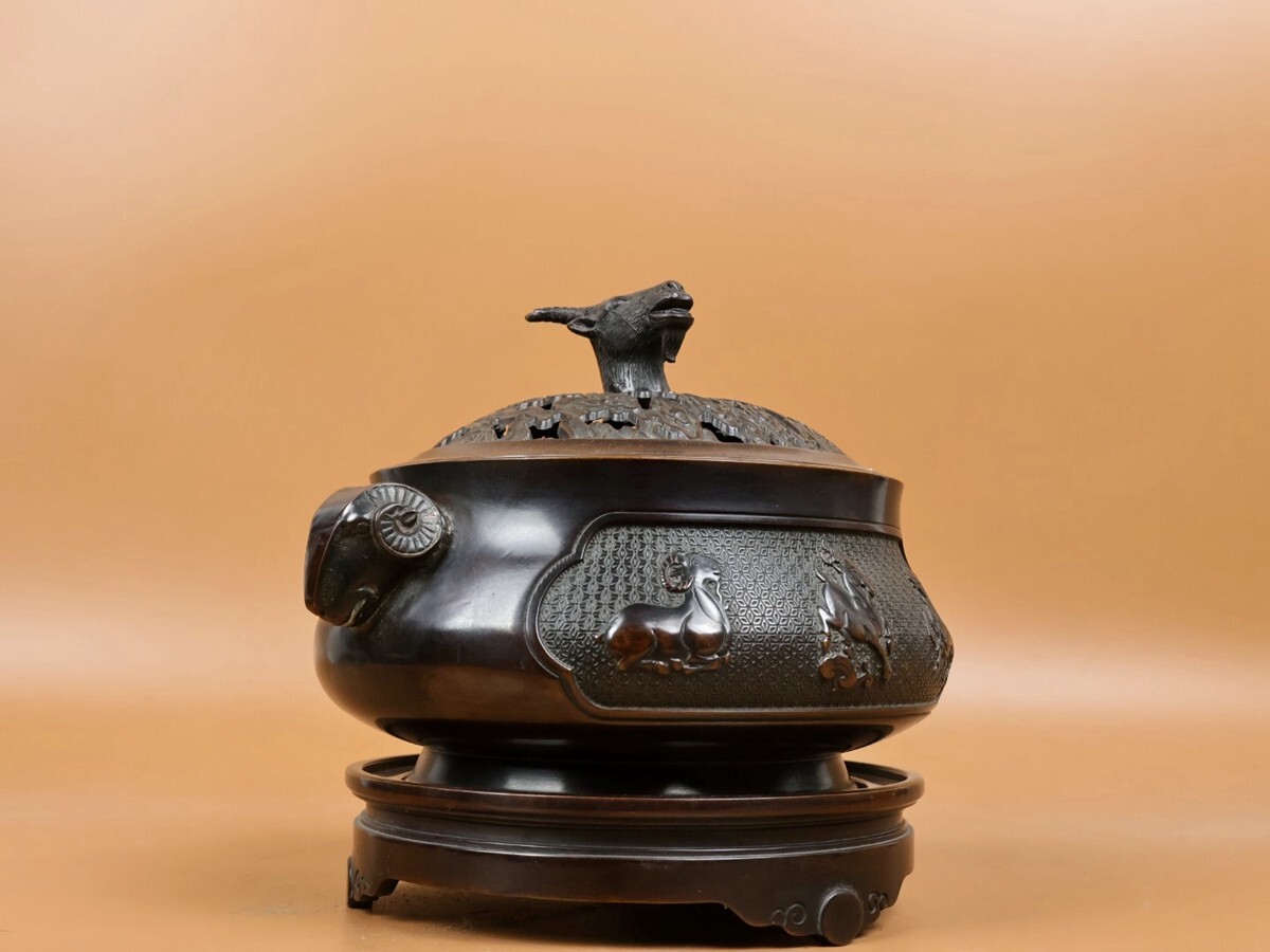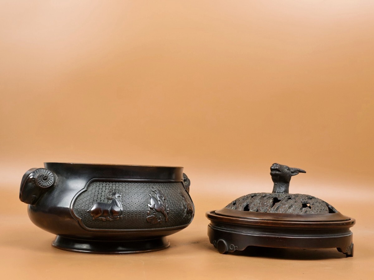 【瓏】古銅鏨刻彫 羊首耳香薰炉 大明宣徳五年監督工部官臣呉邦佐造 銅器 古美術 骨董品 香道具 蔵出