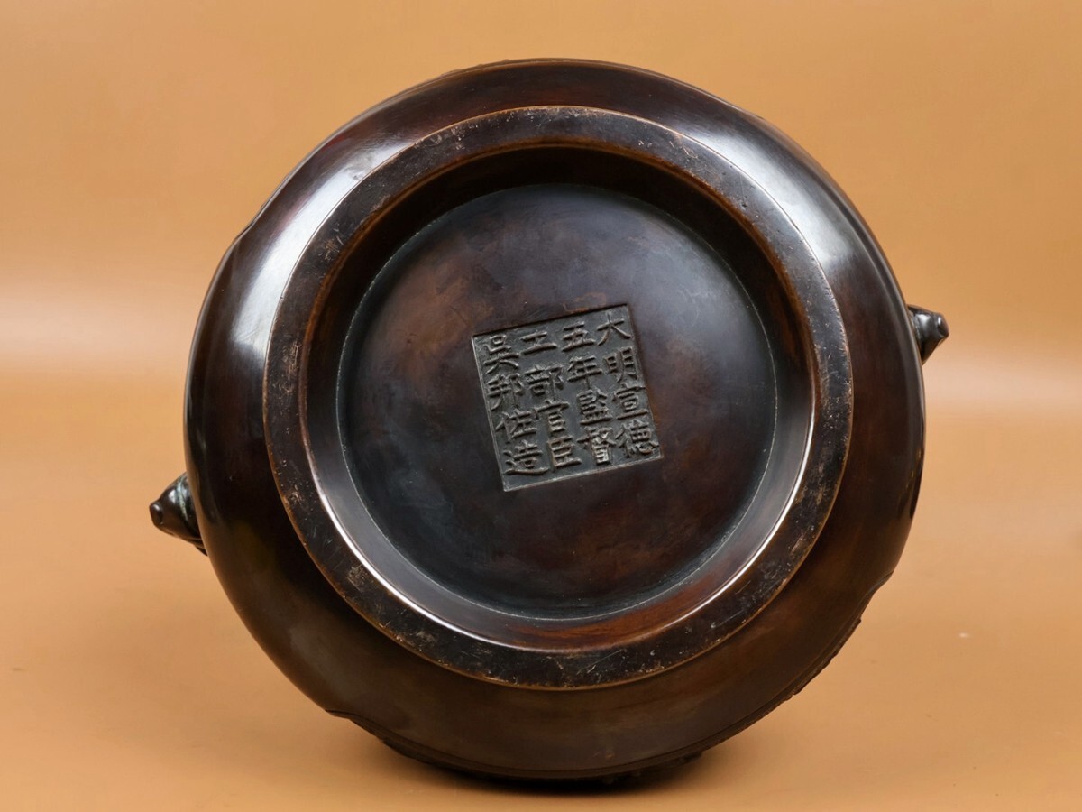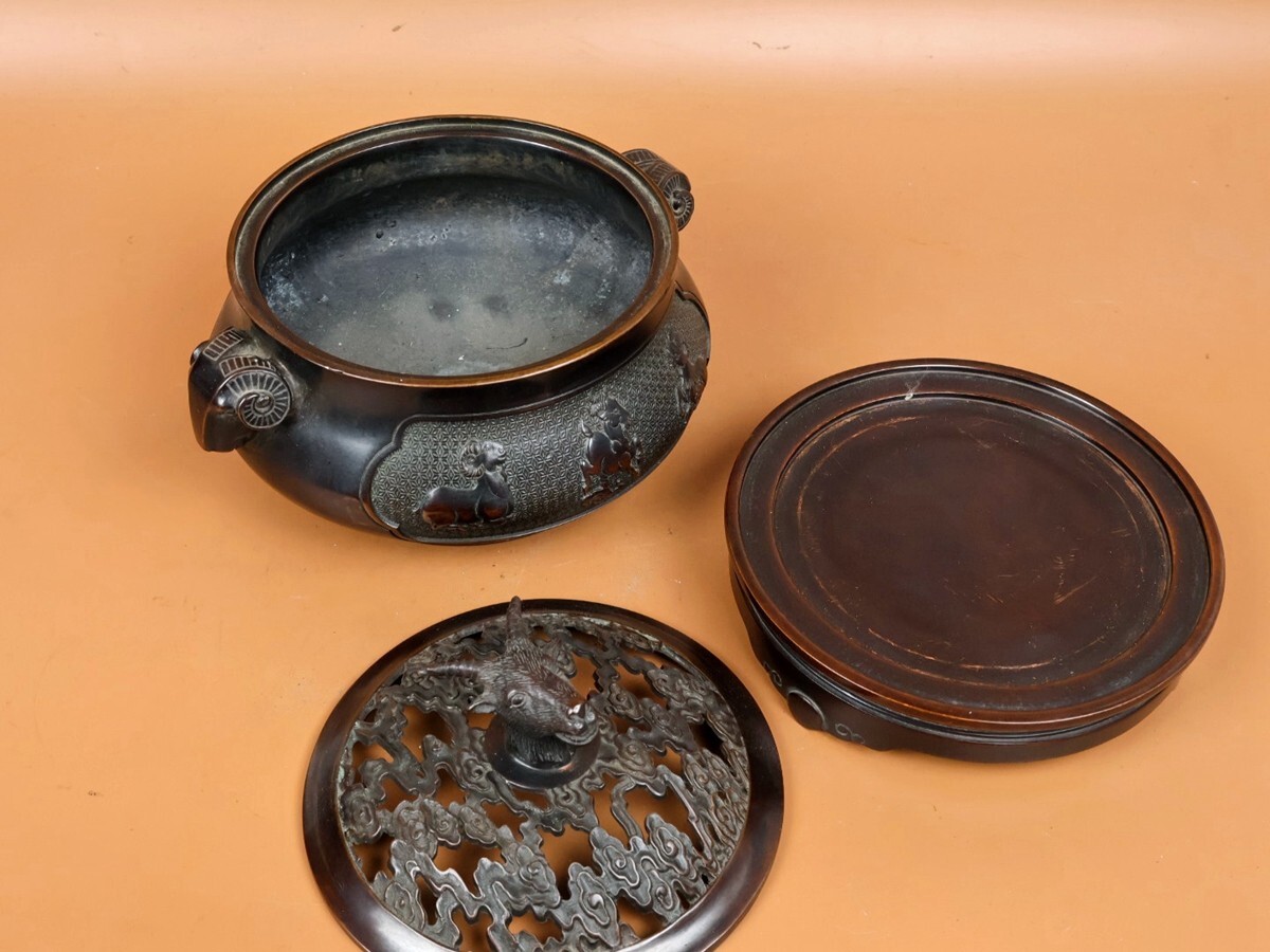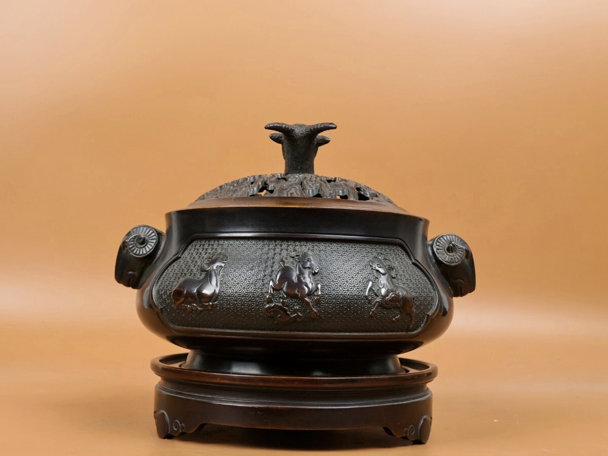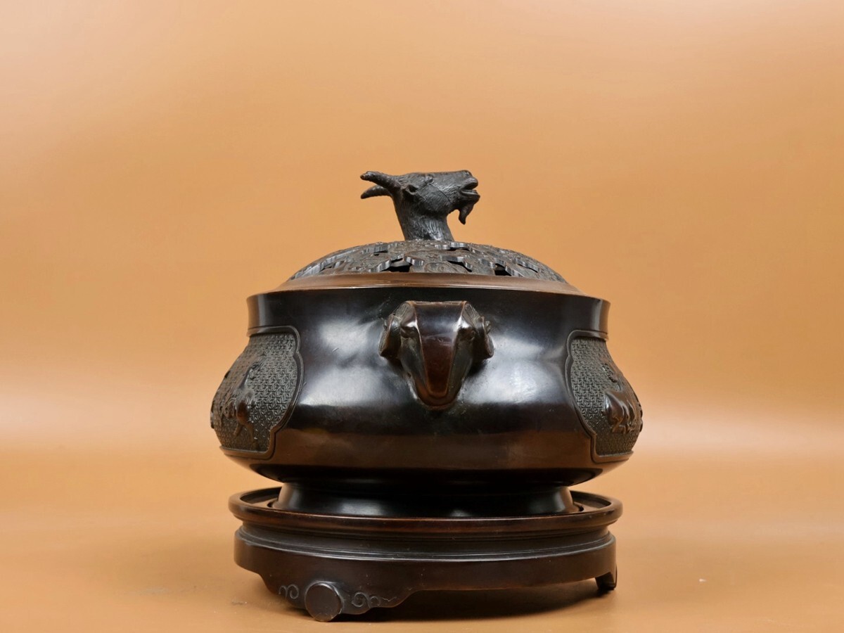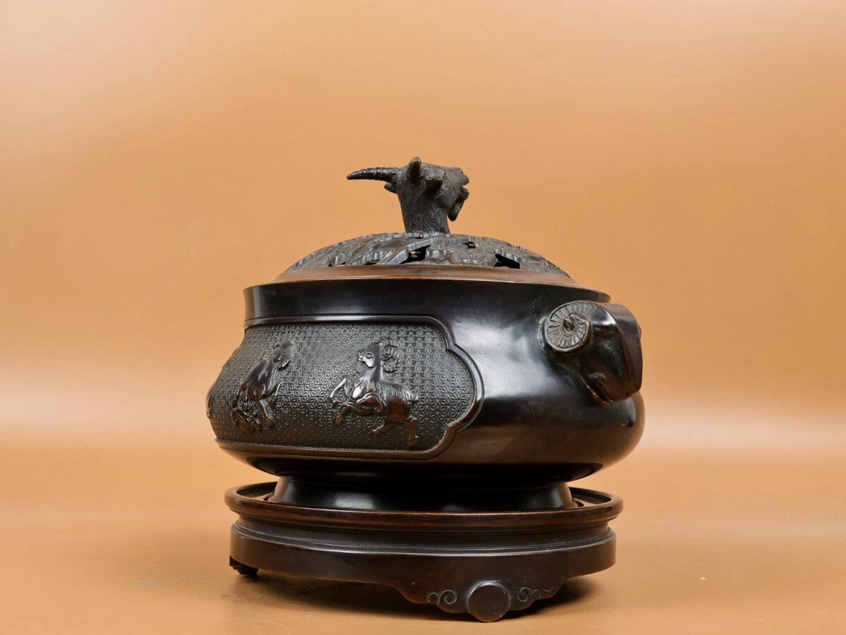 【瓏】古銅鏨刻彫 羊首耳香薰炉 大明宣徳五年監督工部官臣呉邦佐造 銅器 古美術 骨董品 香道具 蔵出