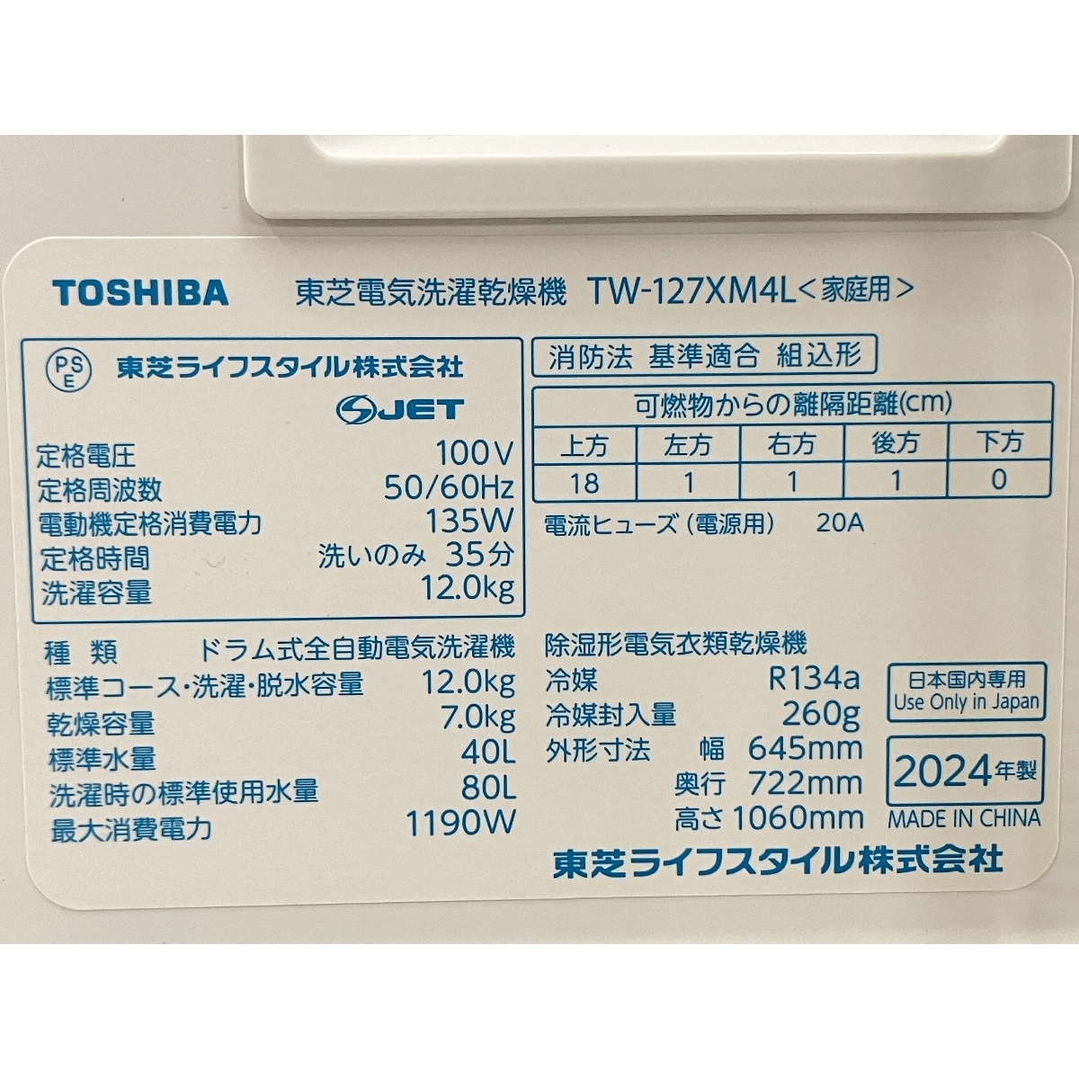 | TOSHIBA TW-127XM4L ドラム式洗濯乾燥機 2024年製 12Kg 左開き 家電 東芝 中古 美品 楽 O10206538 |