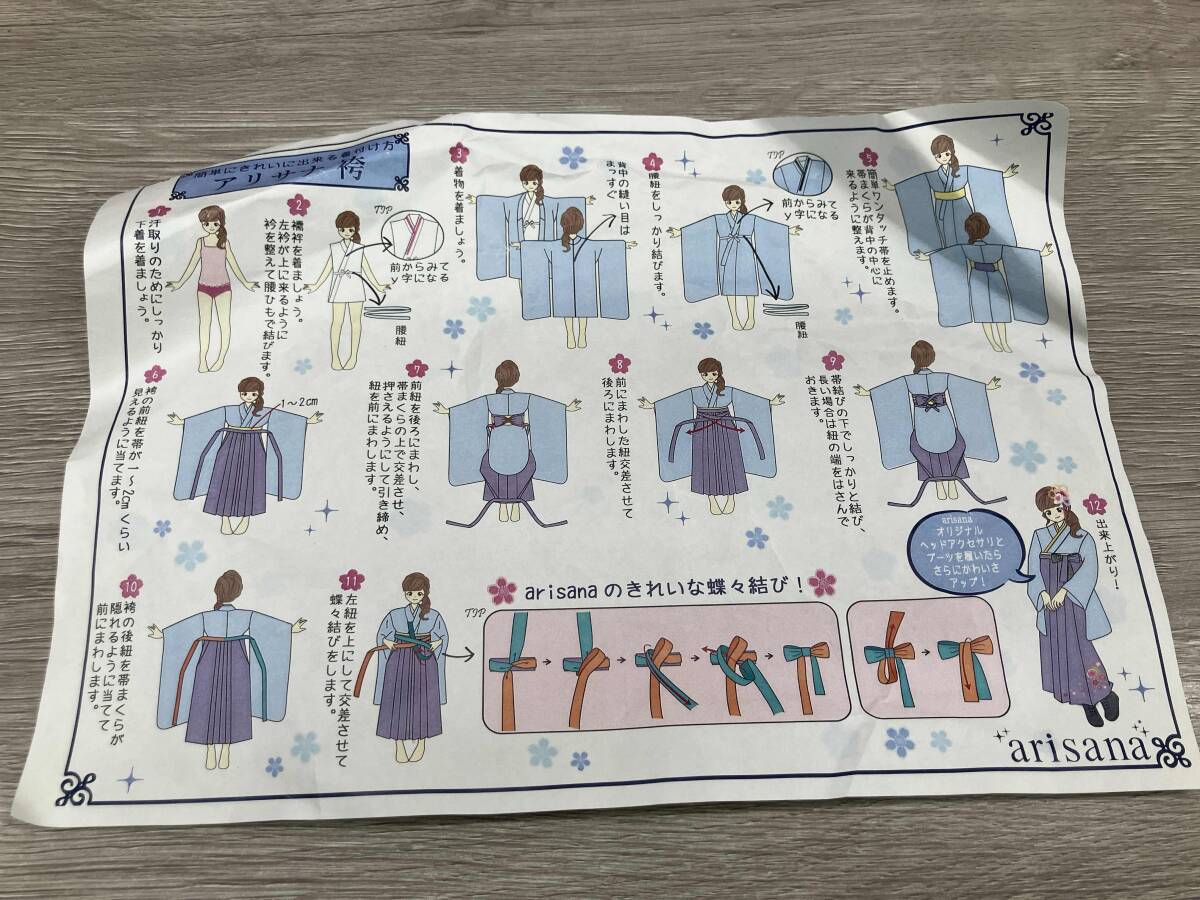 【ブランド名】 arisana 【表記サイズ】 160 サイズ表記(~cm位)は目安です。ブランドやデザインによって多少前後する場合がございます。予めご了承の上ご注文ください。 【付属品】 画像の物が全てです 着付け方付き (紙のプリント) 【着物平置きサイズ】 着丈:約87cm 袖丈:約 86cm 裄丈:約 69cm 【袴平置きサイズ】 袴下:約90cm |
