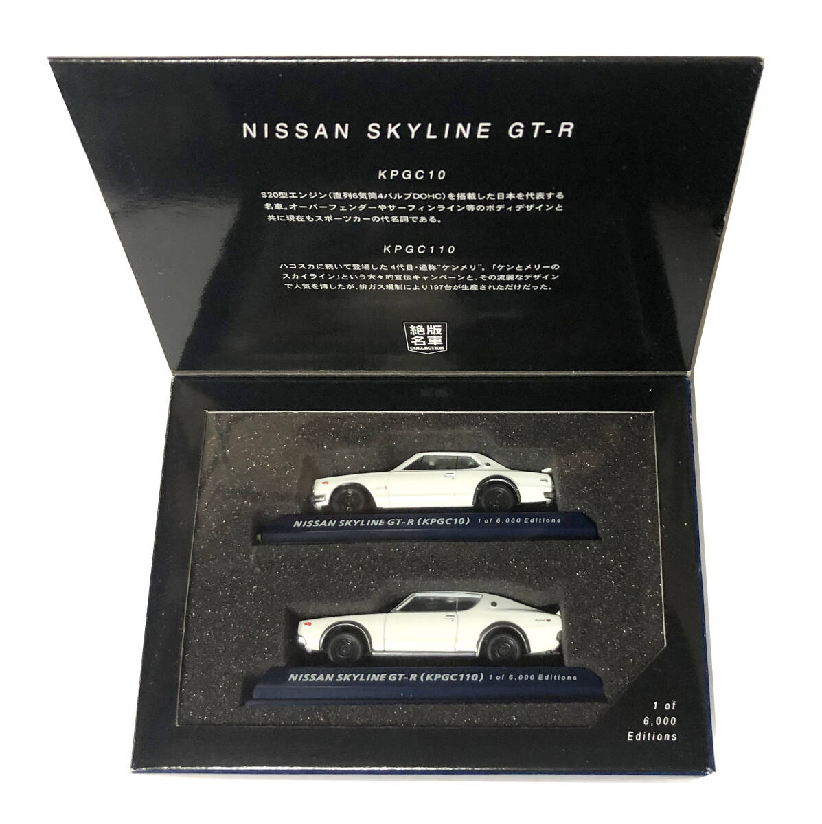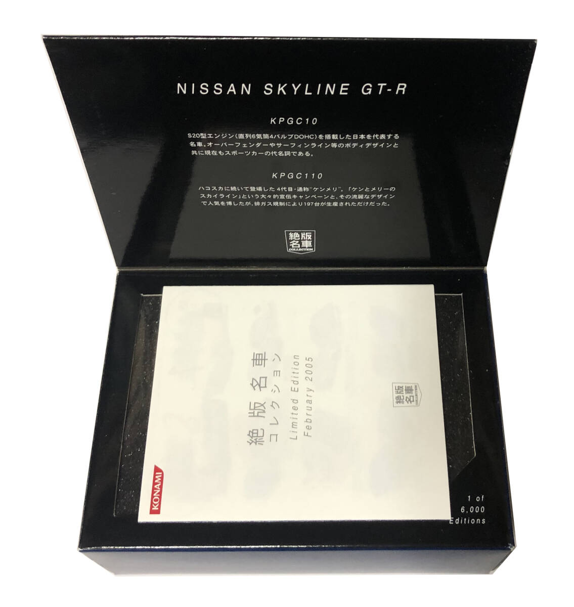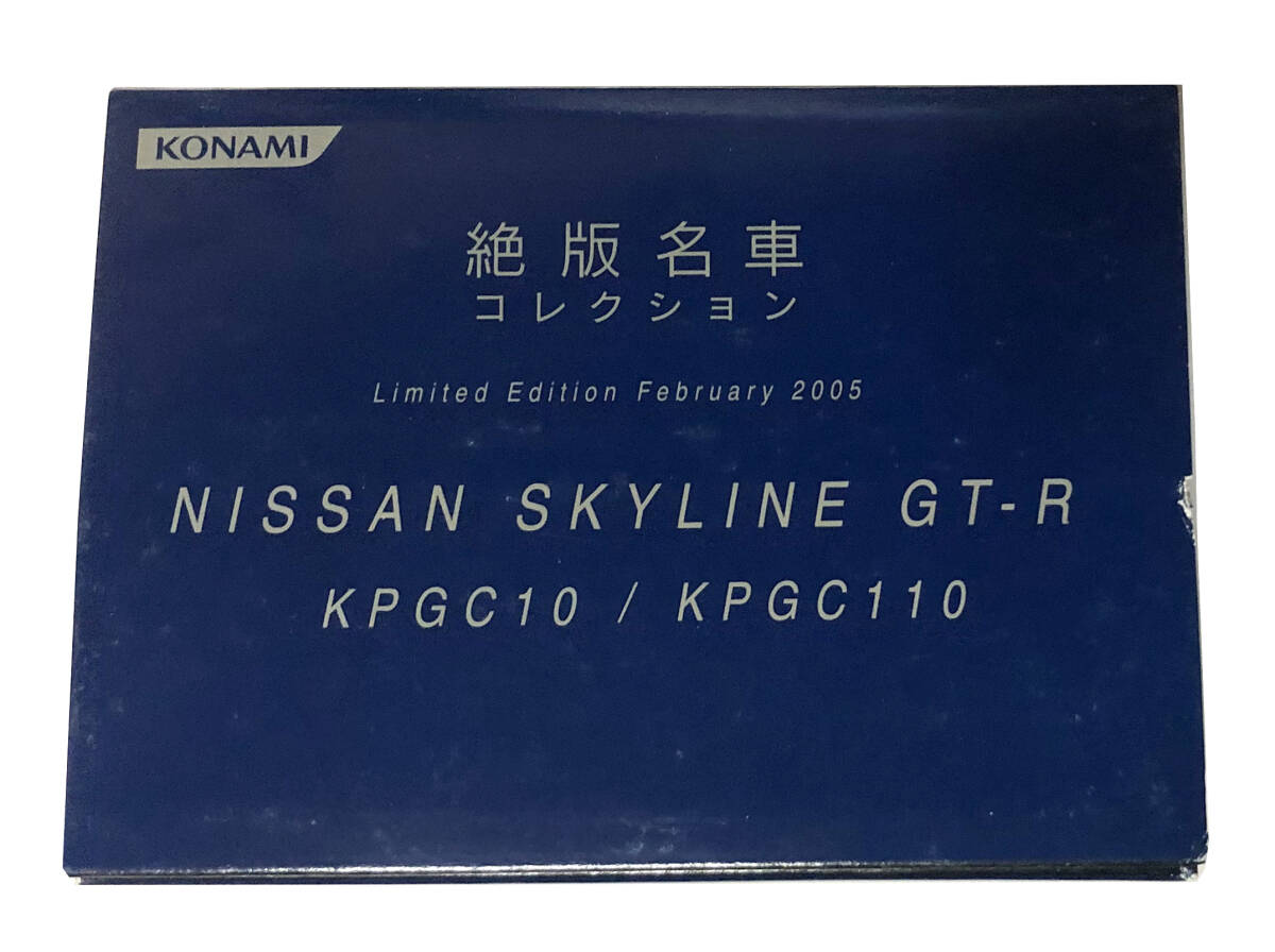 2005年2月にコナミから発売された  絶版名車コレクション Limited Edition 2005 NISSAN SKYLINE 2台(GT-R KPGC10/KPGC110)セットです。1/64 SCALE。未使用。未使用ではありますが、当初からの外箱等の細かな傷等や完品をお求めの方は、ご遠慮下さい。外箱に少し凹み等があります。また未使用ではありますが、時間が経過しておりますのであくまでも中古品としてお考え下さい。ノークレーム・ノーリターンでお願い致します。