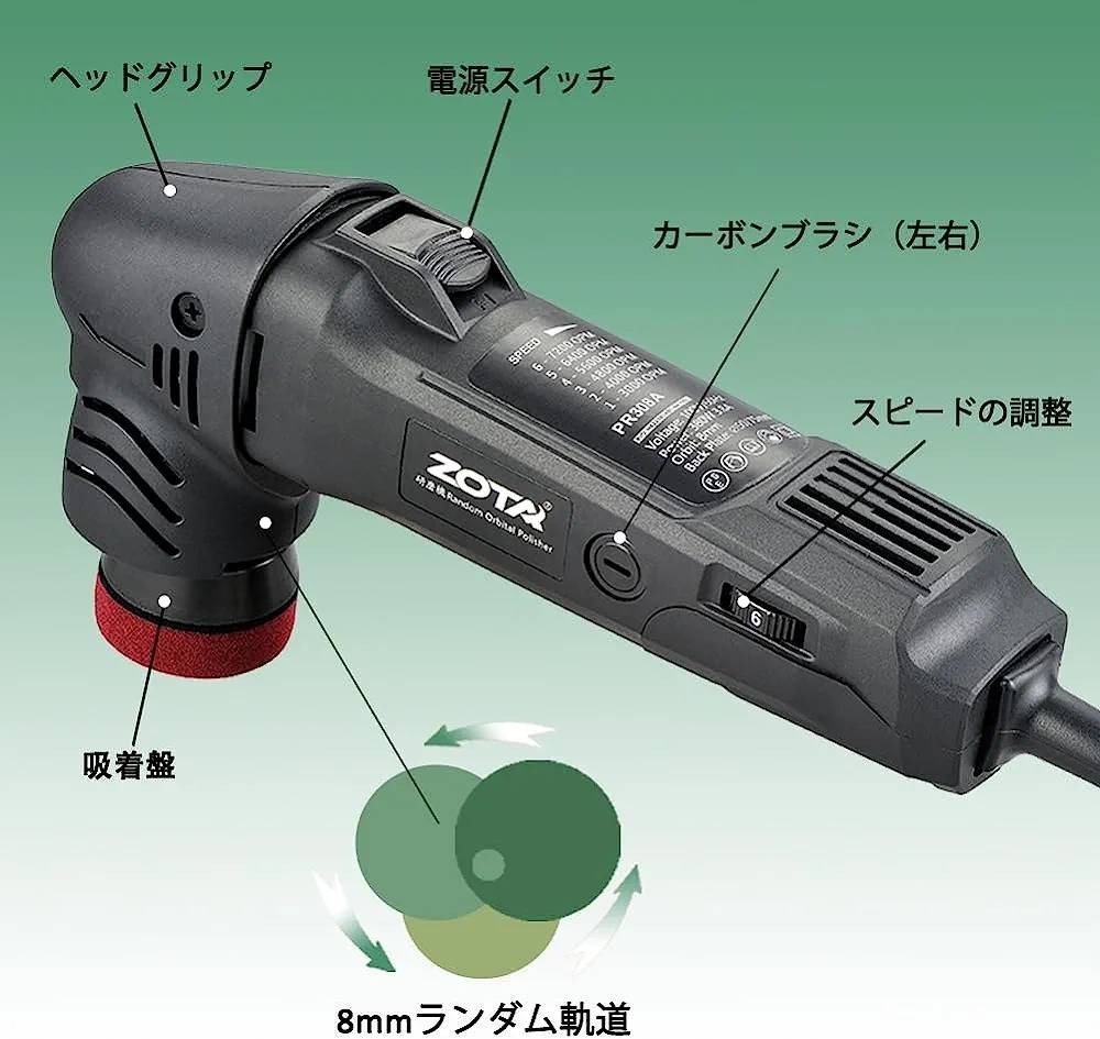 低騒音 優れた性能この軽量な研磨機は6段変速で強力なモーターと精密歯車を持ち、低騒音かつ低振動で使い勝てがよく、長期な耐久性と安定した動作に優れています。 自動車、ボートの錆び消しと研磨に、台所やバスルームタイルの磨きに、特にヘッドライト、テールライト、リアスポイラー等の磨きに適しています。
