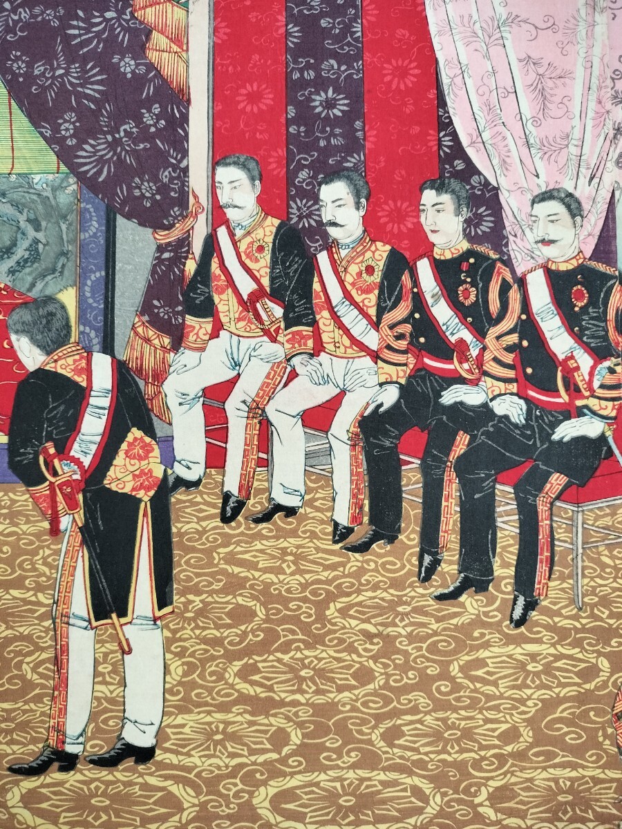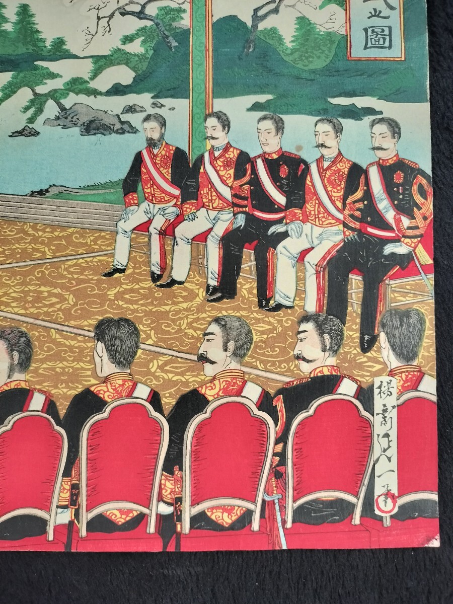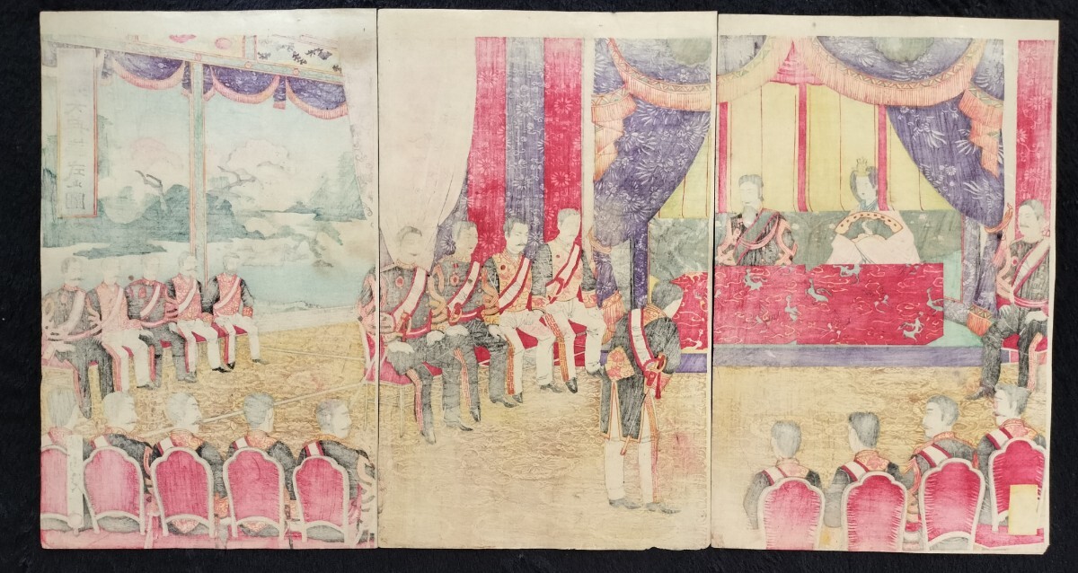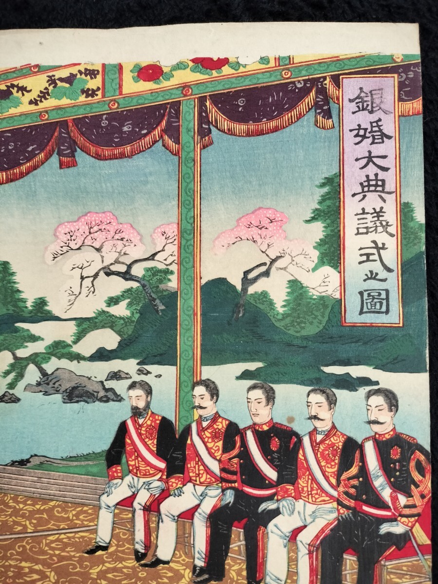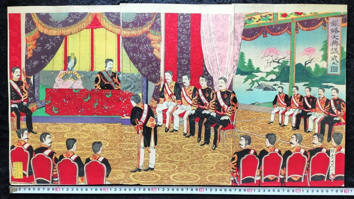 明治期/真作 楊斎延一「銀婚大典議式之図」本物浮世絵木版画 武者絵 開化絵 錦絵 大判 三枚続き 裏打ち