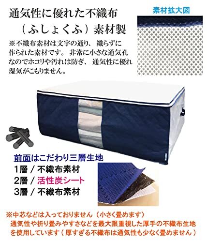 【通気性の良い布団収納ケース】通気性の良い厚手不織布製。前面に活性炭シートを加工し、大切な布団や寝具をにおい・ホコリ・汚れから守ります