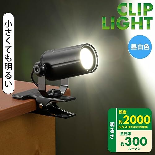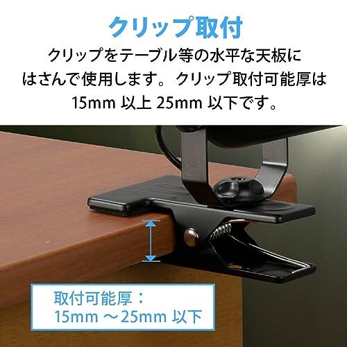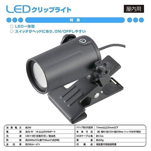 ・【 仕 様 】 ◆消費電力:約5W ◆電源:出力5V 1A以上のUSBポート ◆光源:LED×9灯(交換不可)/昼白色 ◆照度:約2000ルクス(直下30cmで点灯時) ◆全光束:約300ルーメン ◆クリップ取付可能厚:15mm以上25mm以下
