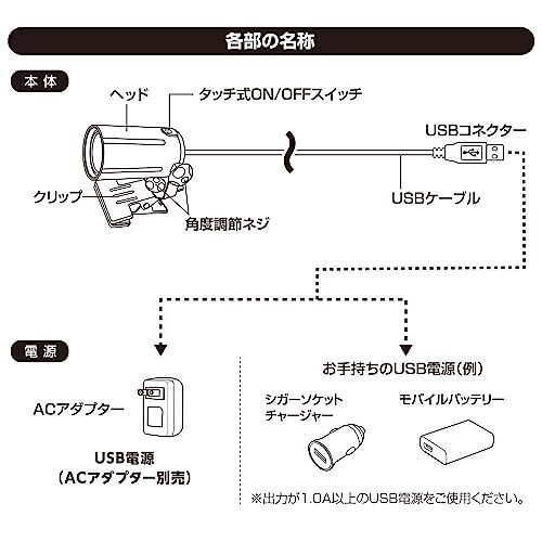 ・【 特 長 】 ◆小さくても明るい ◆全光束約300ルーメン、照度約2000ルクス※直下30cm ◆LED一体型 ◆スイッチがヘッドにあり、ON/OFFしやすい ◆USB電源(ACアダプター別売) ◆屋内用 ◆本体カラーはブラック