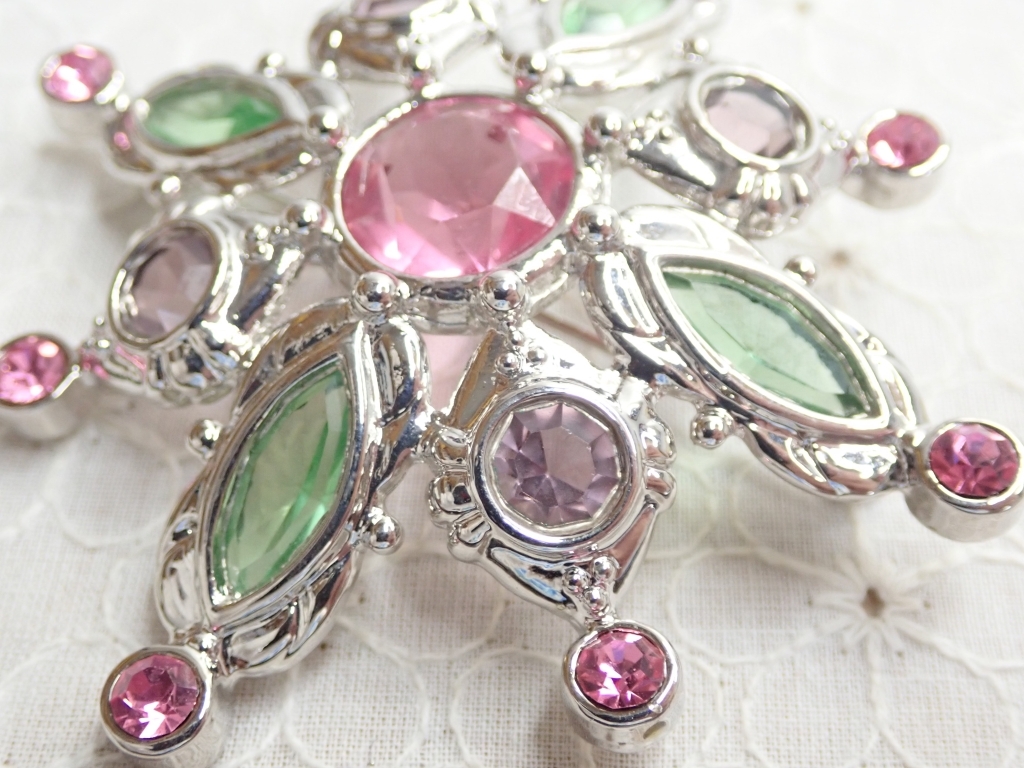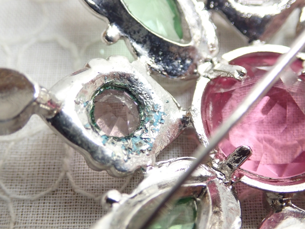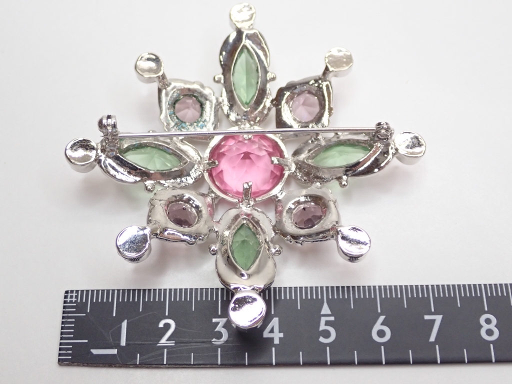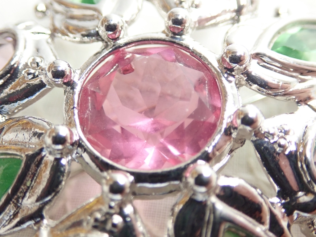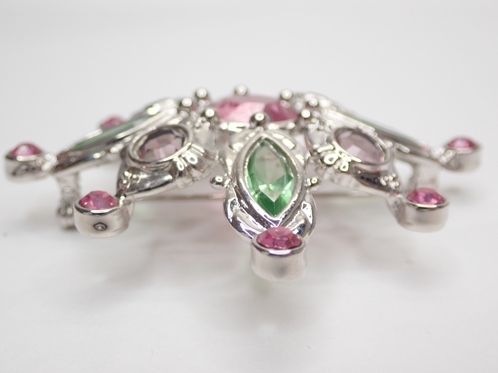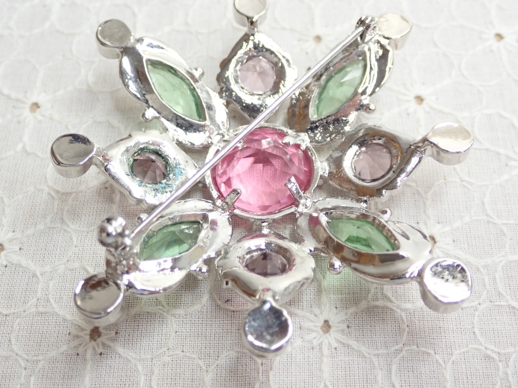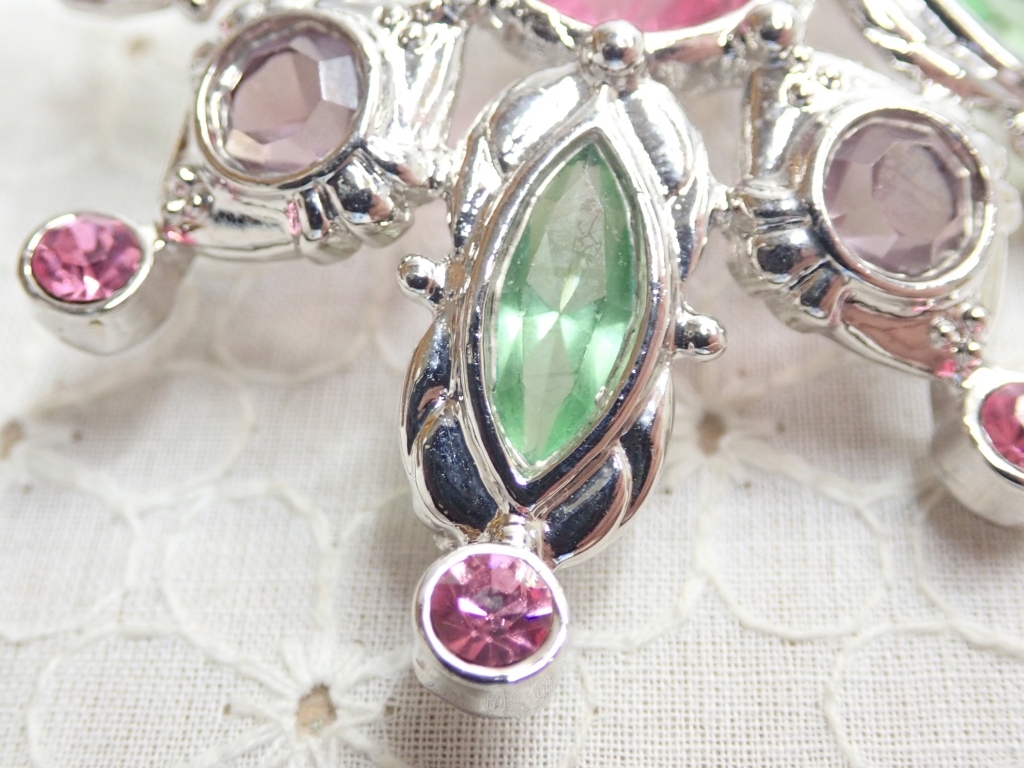 L720 ヴィンテージ デザインブローチ カボッション グリーン×パープルピンク ラインストーン Vintage brooch