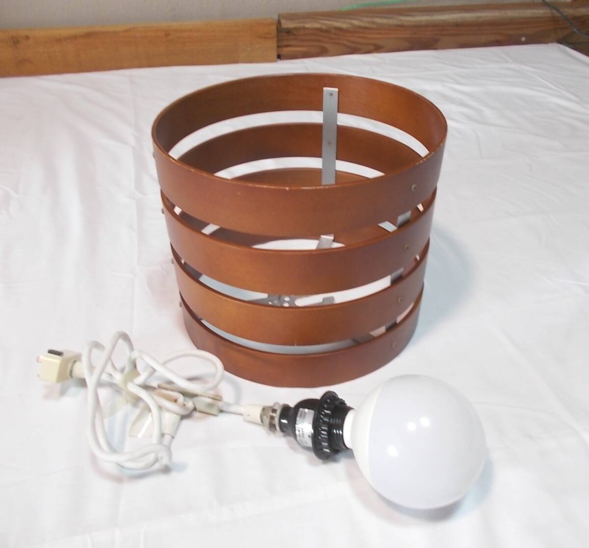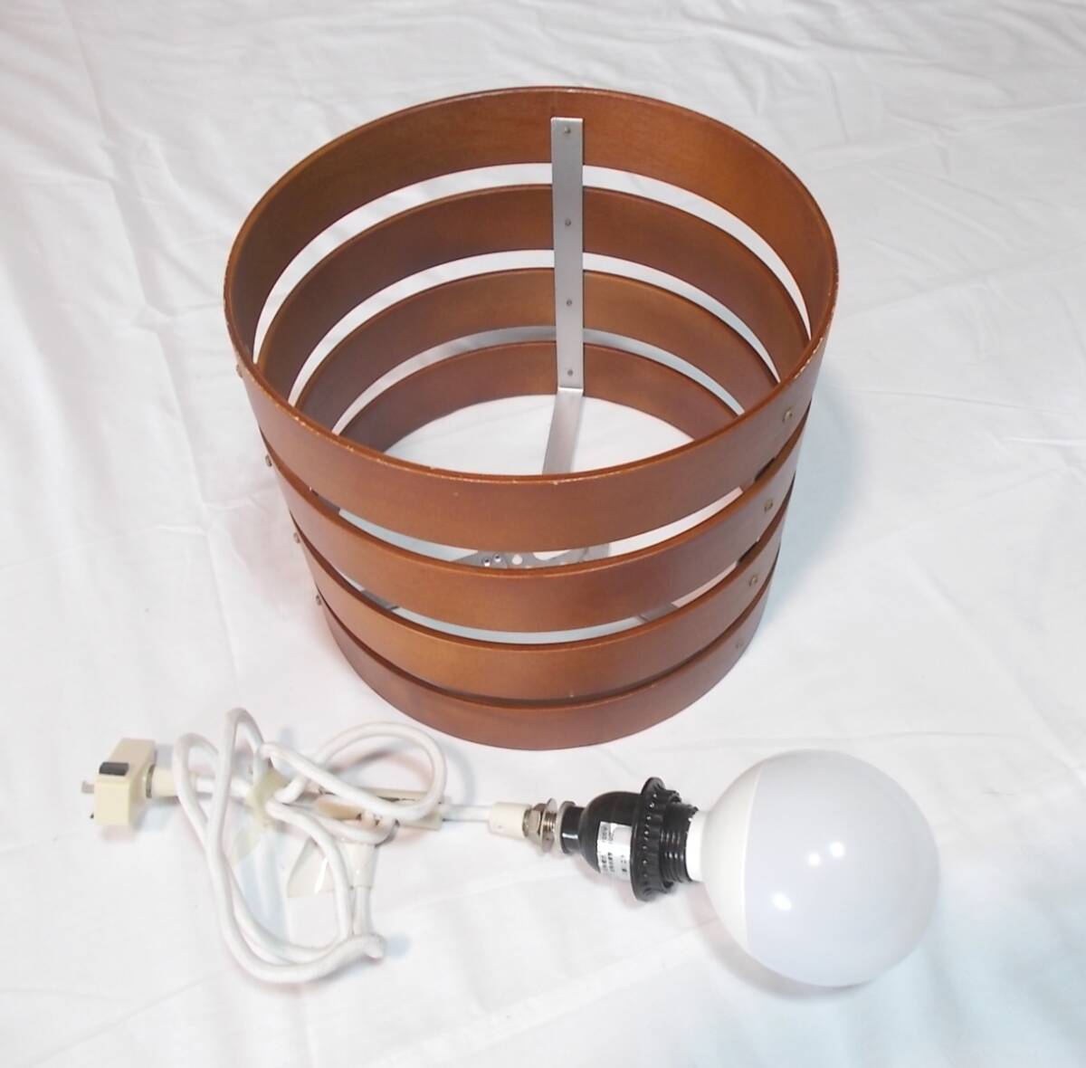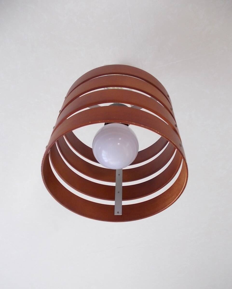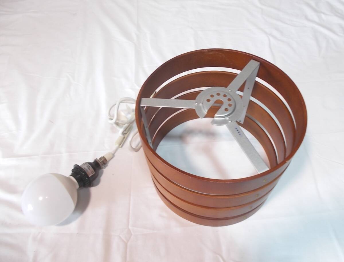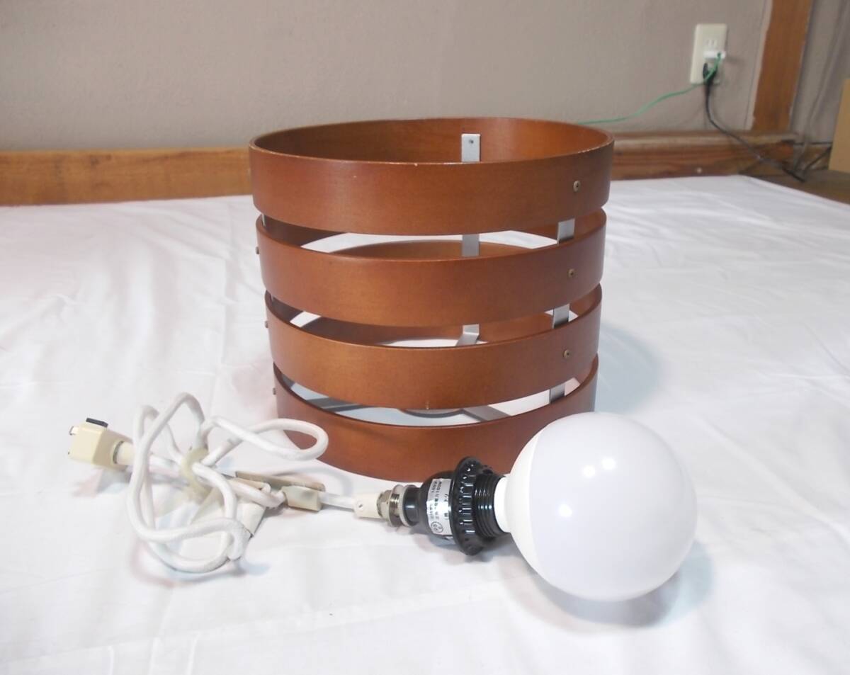 木製シェードの1灯ペンダントライト、電球付きです。