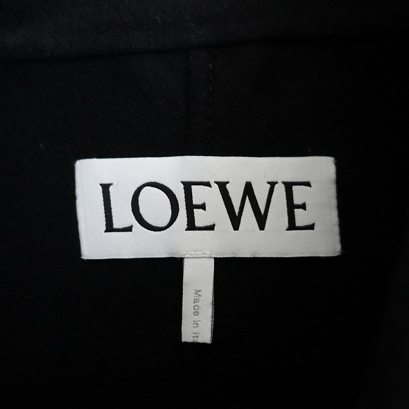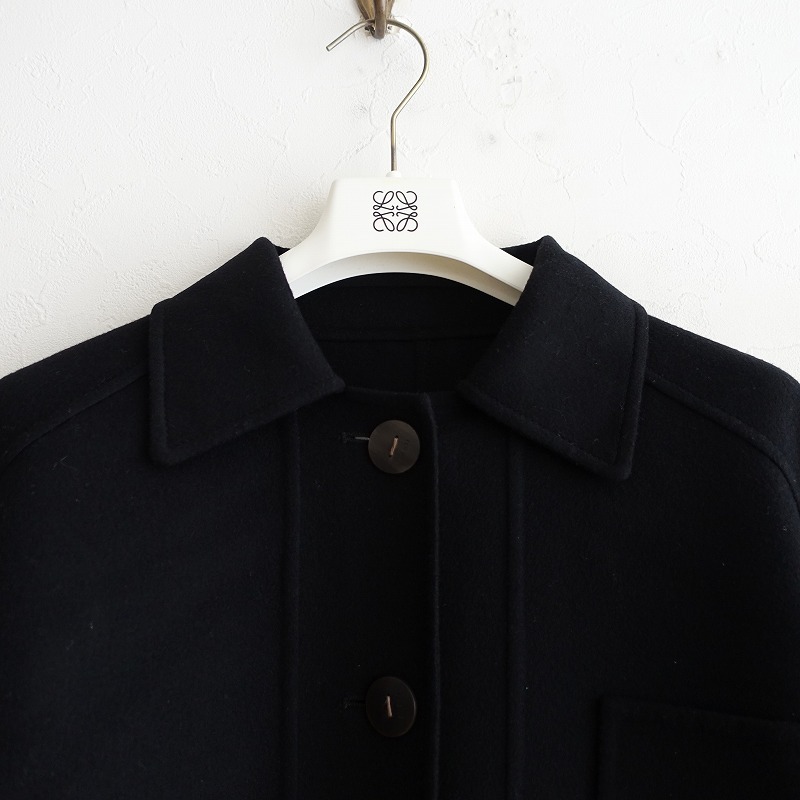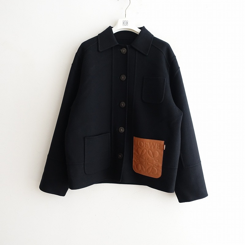 LOEWEのワークウエアジャケット ウール&カシミヤです。カラーはブラックで、ウールカシミヤのメルトン素材で仕立てられています。ボタン開閉で、3ポケット付き、左サイドのレザーポケットがアクセントです。付属のハンガーがございます。 |