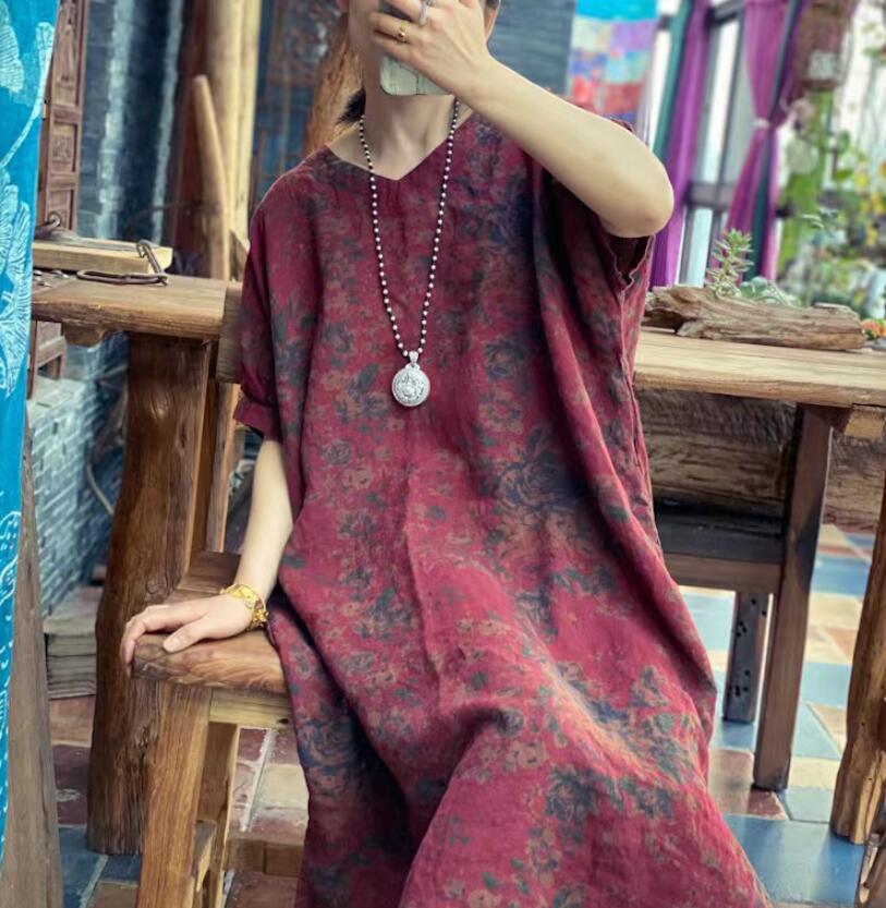 新入荷Vネック ワンピース チュニック アンティーク風 洋服ミックス ロマンファッション 麻100% RINENリネン 半袖高質 レッド系