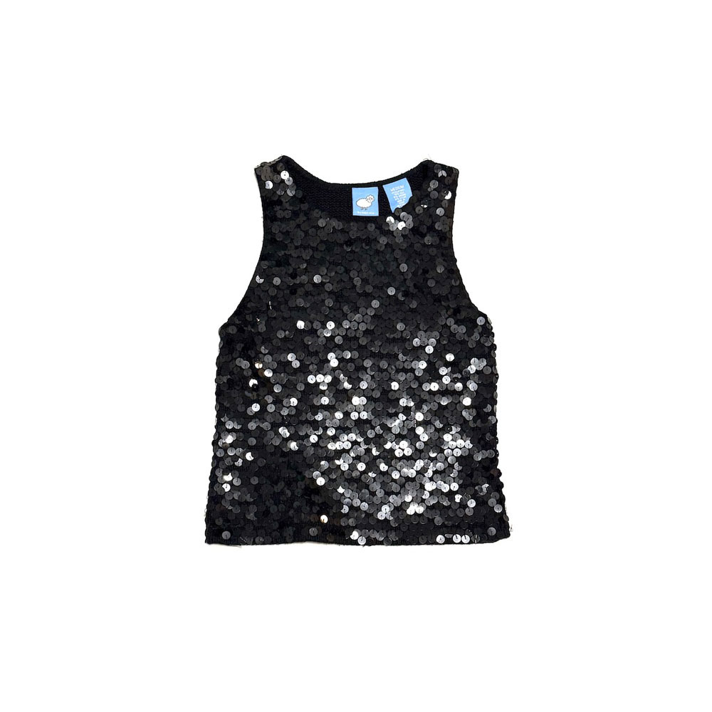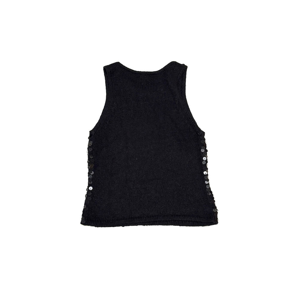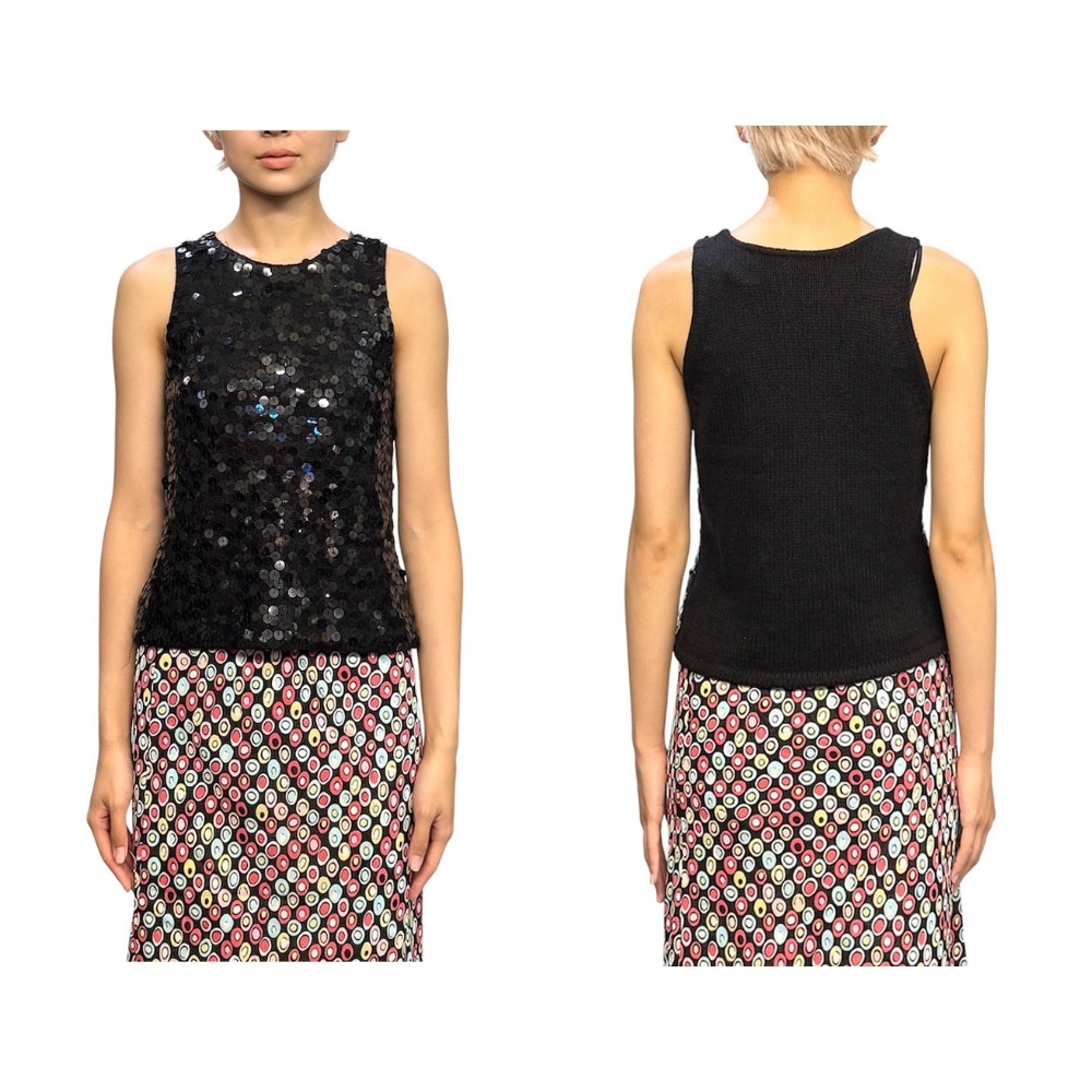 USEDの00's by next era スパンコール シルクアンゴラ混 ニットタンクです。煌めくブラックスパンコールが全面にあしらわれたノースリーブニットタンク。上品な光沢感がありながら、程よいラフさも感じる絶妙なバランス。素材はシルク、アンゴラ、ナイロンの混紡で肌触りも軽やか。背面は無地ニット仕様で、主張しすぎずコーデに取り入れやすい1着です。1枚での着用はもちろん、ジャケットやカーディガンのインナーにも◎。