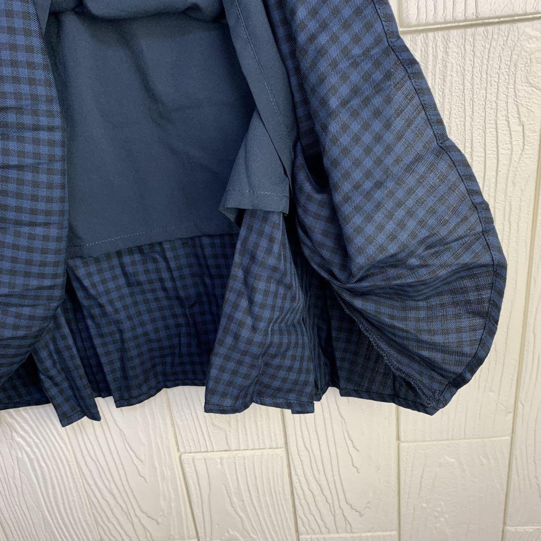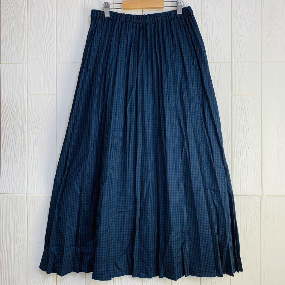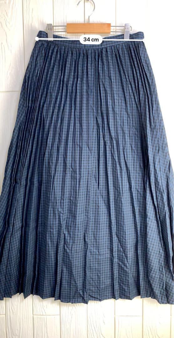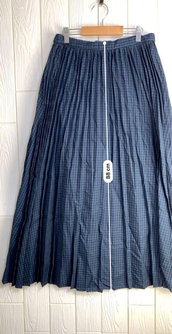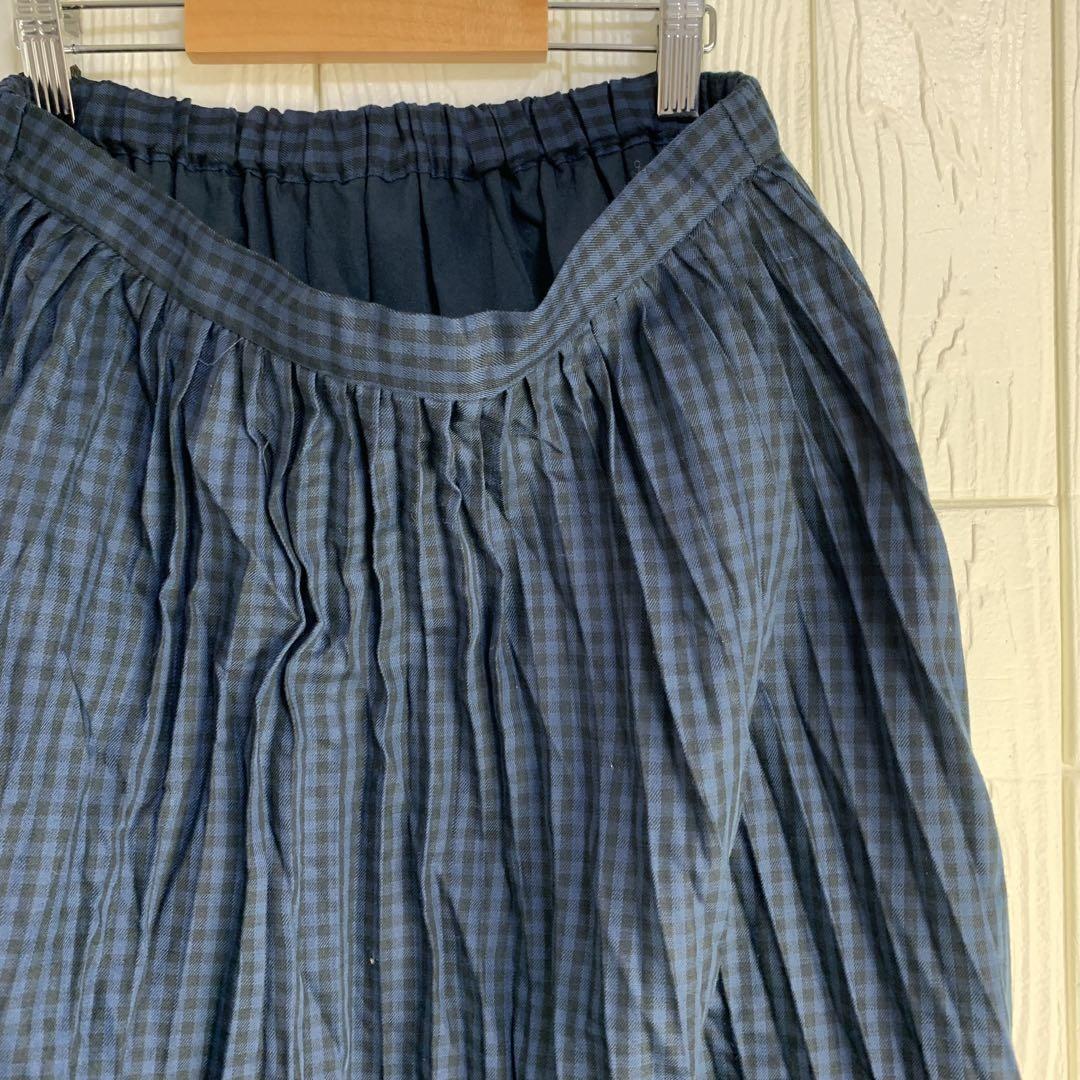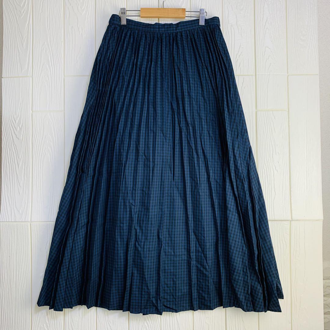 ダークグリーンのチェック柄プリーツスカート、ウエスト68cm、丈88cm。