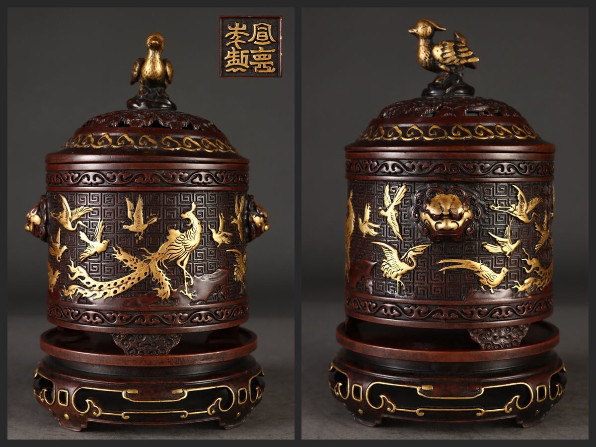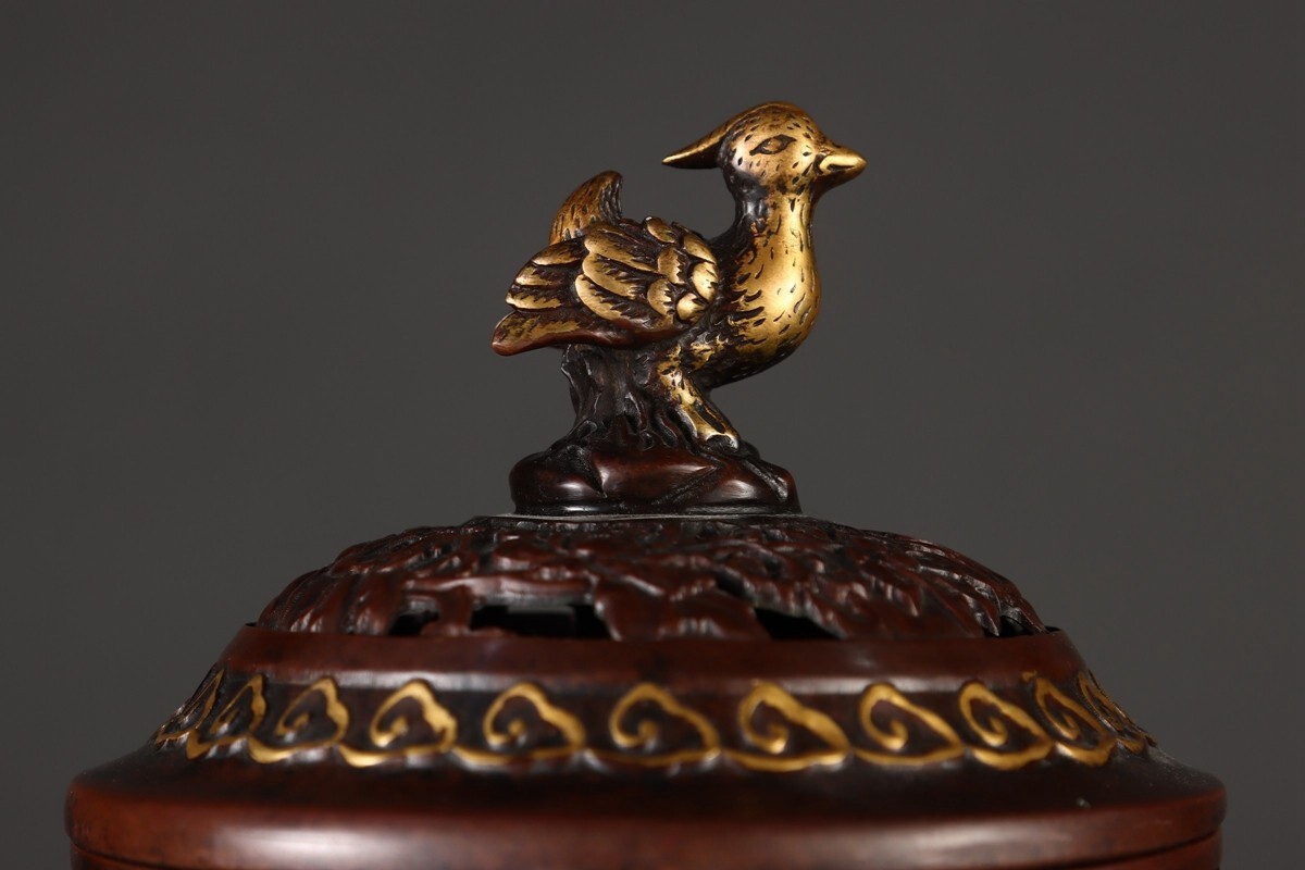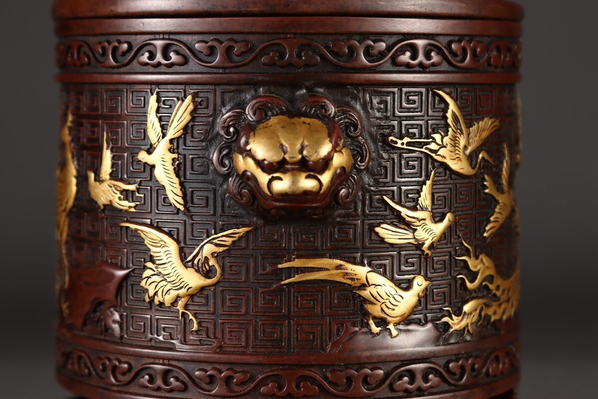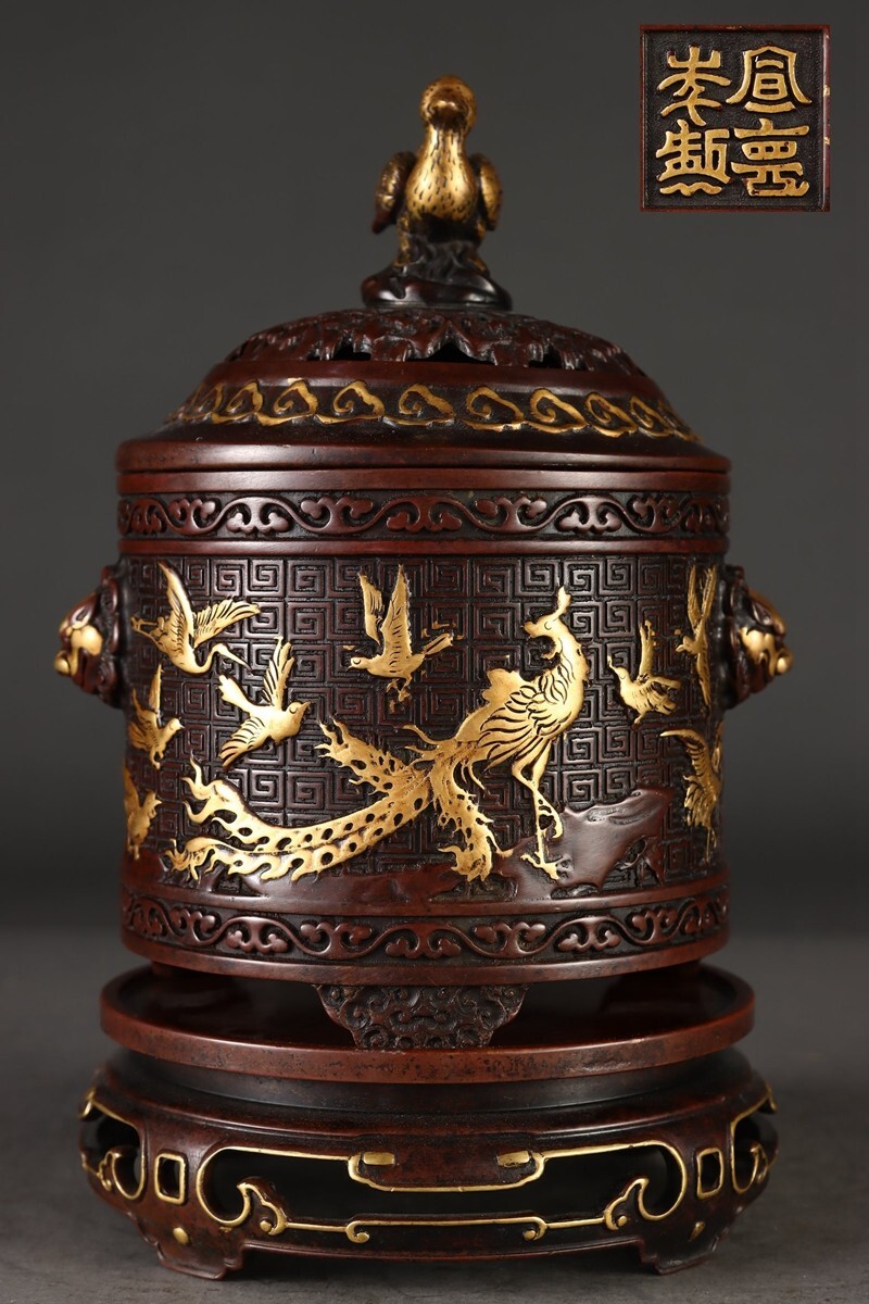 【瓏】古銅鏨刻彫 塗金百鳥朝鳳紋 筒式薰炉 明時代 宣徳年製款 銅器 古美術 骨董品 香道具 蔵出