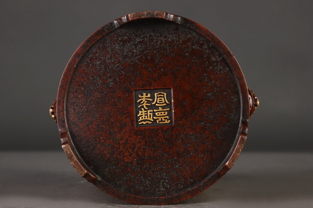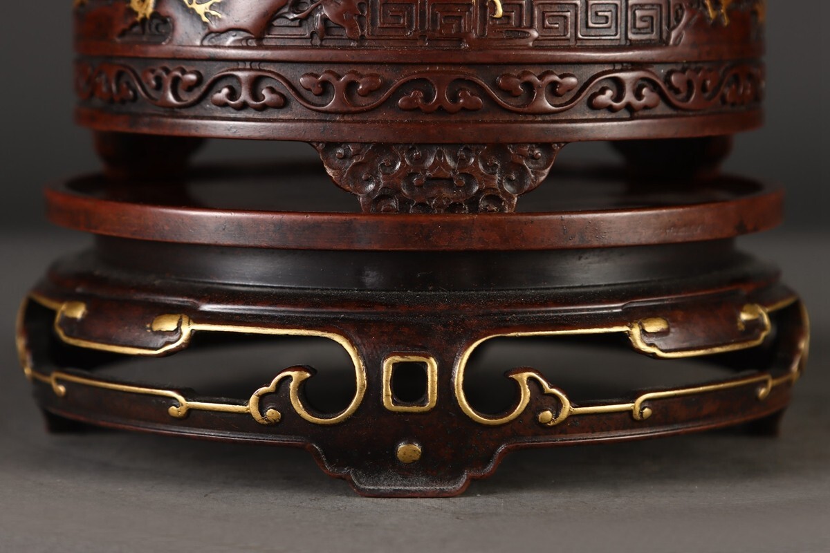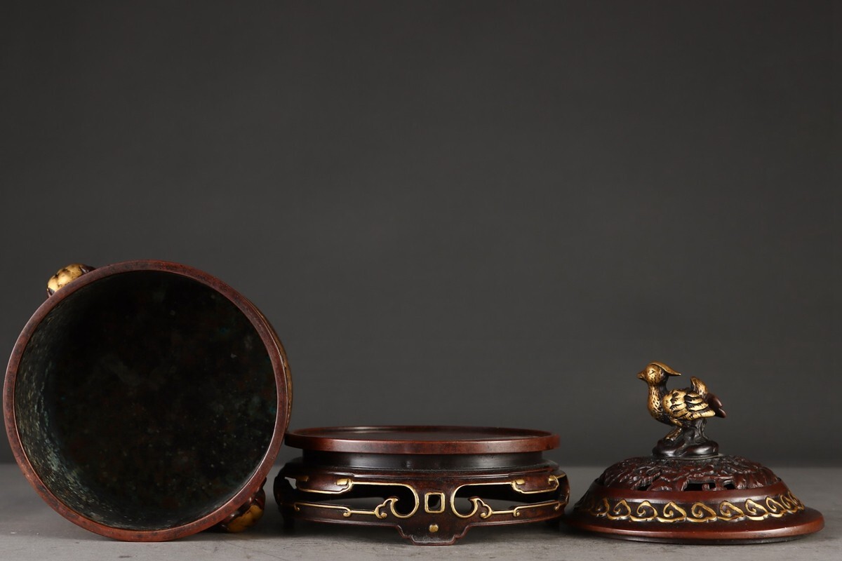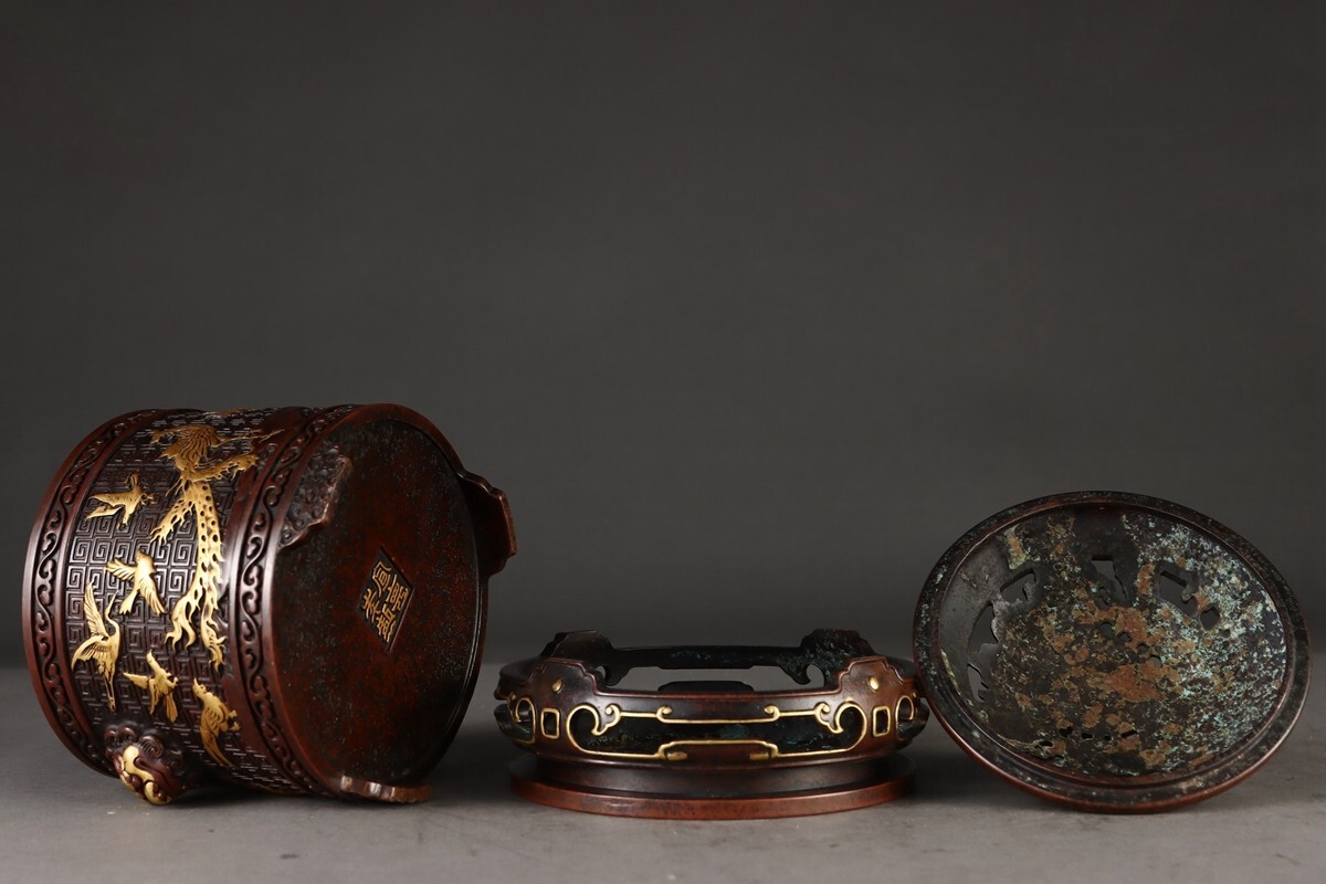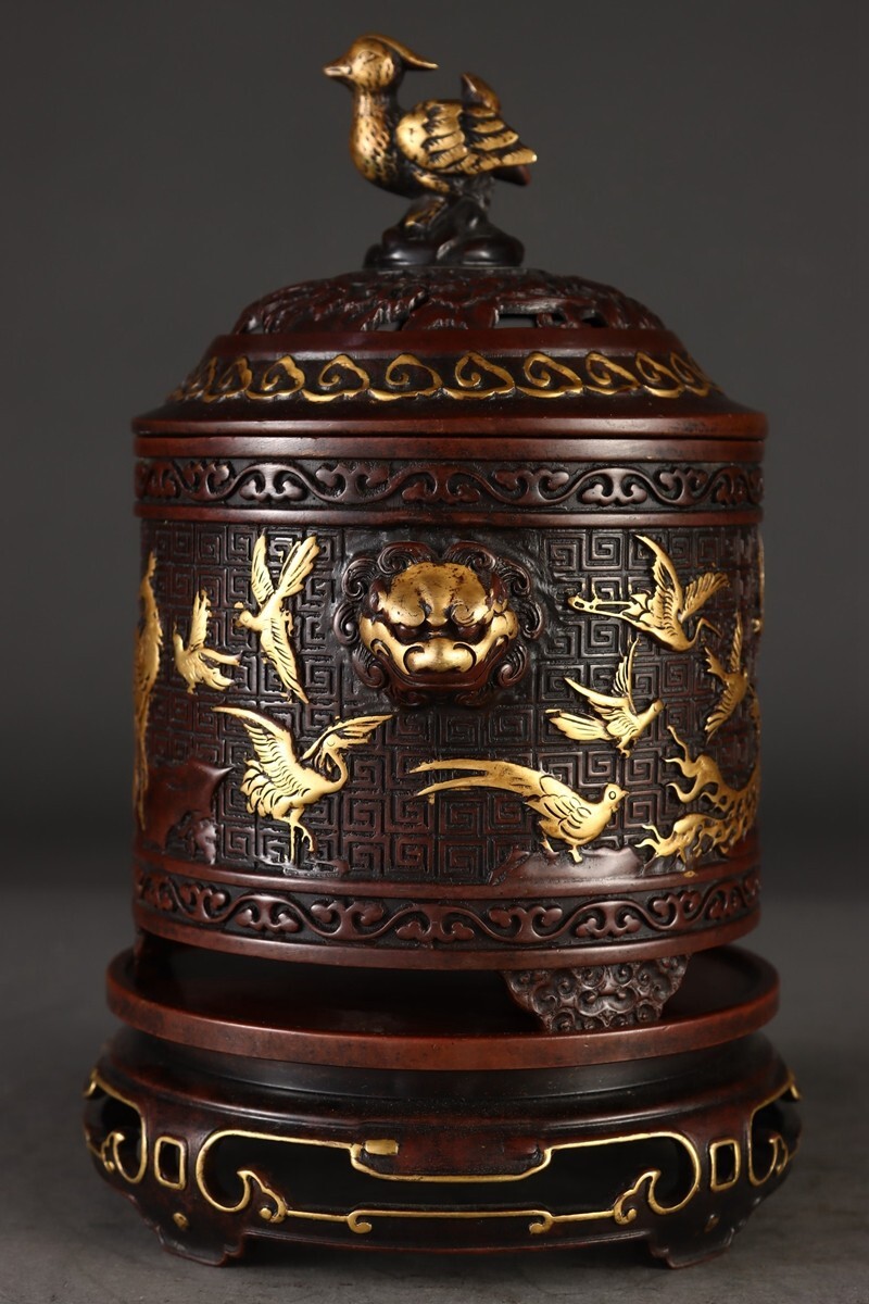 【瓏】古銅鏨刻彫 塗金百鳥朝鳳紋 筒式薰炉 明時代 宣徳年製款 銅器 古美術 骨董品 香道具 蔵出