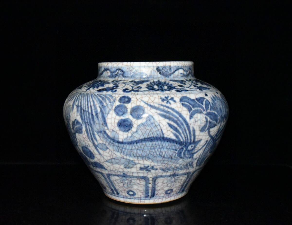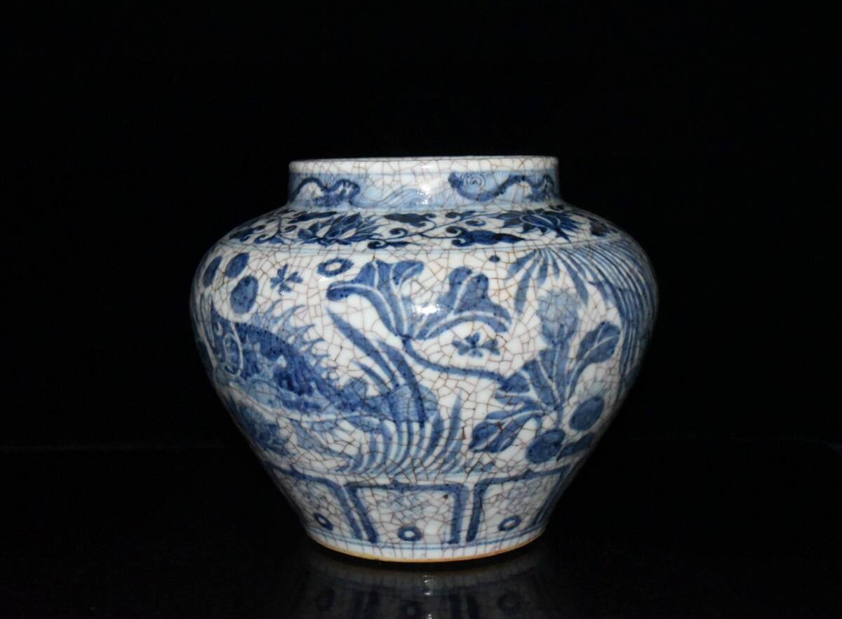 【超珍館蔵】元 古陶瓷品 青花 開片 魚藻紋罐 陶藝 古賞物 古董品 古美術品 時代物 旧家蔵出 稀少珍蔵品