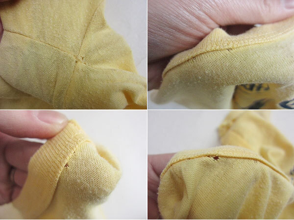 全体の状態 | 全体に毛玉があります。襟回りに穴の連なり、脇にも小穴があります。襟回りと裾周りのステッチが抜けており、裾の内側は縫い付けが開いた状態です。背中側に汚れがあります。 使用感がありますので、現状のコンディションにご理解いただいた上、ご検討ください。 |