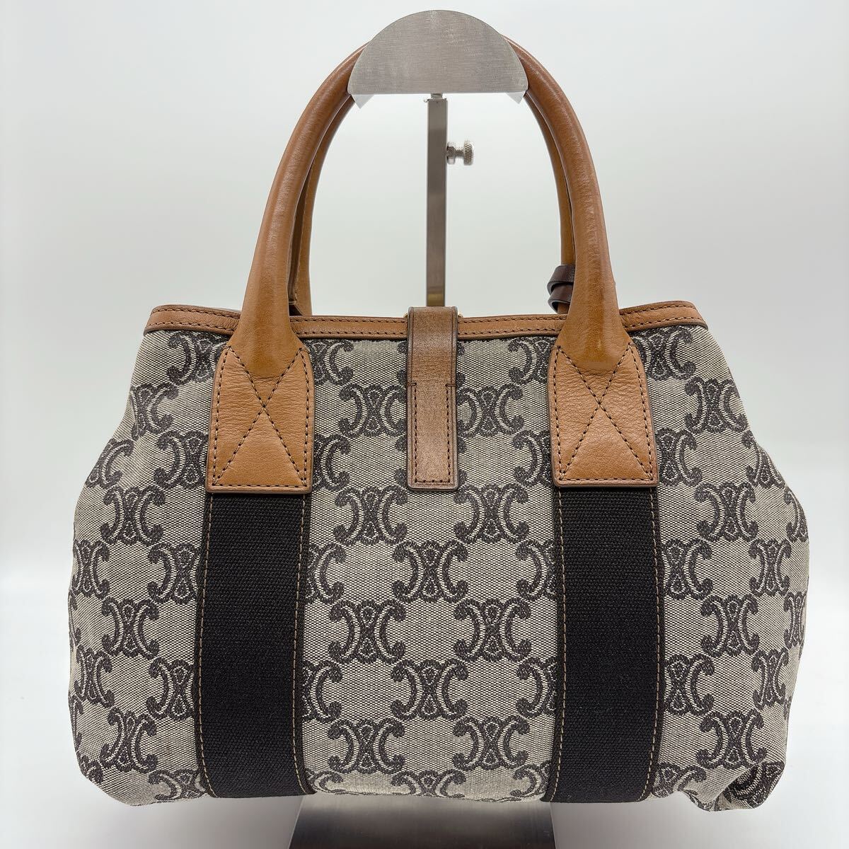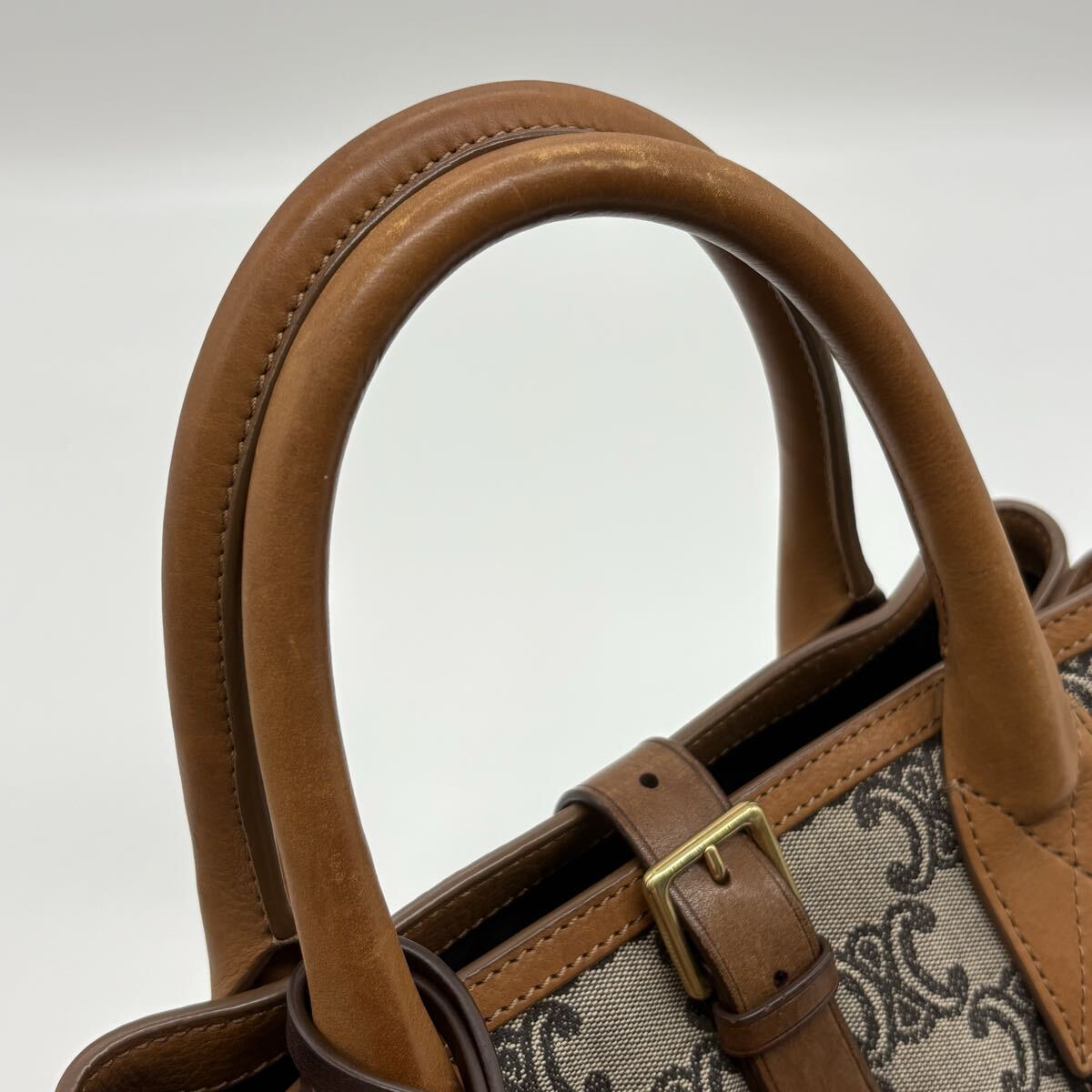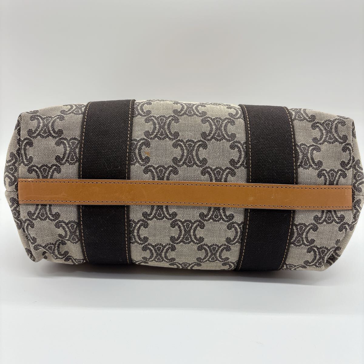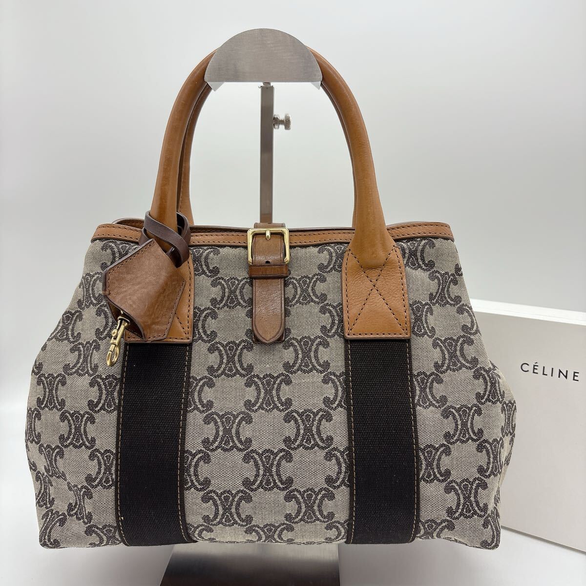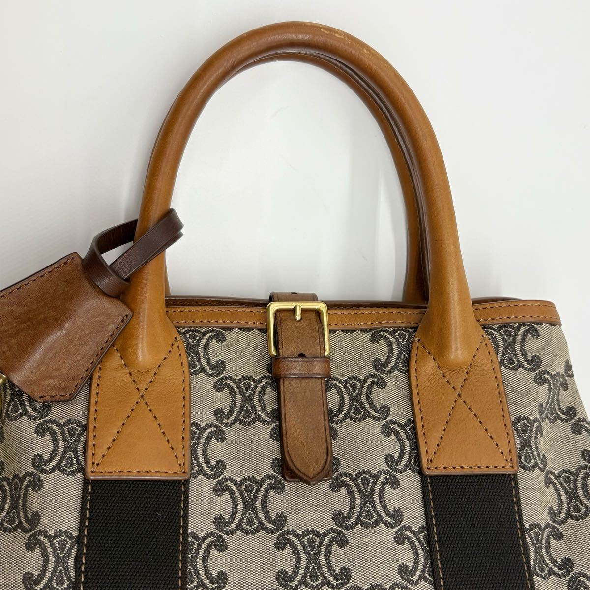 Authentic CELINE handbag with signature Triomphe canvas and brown leather.