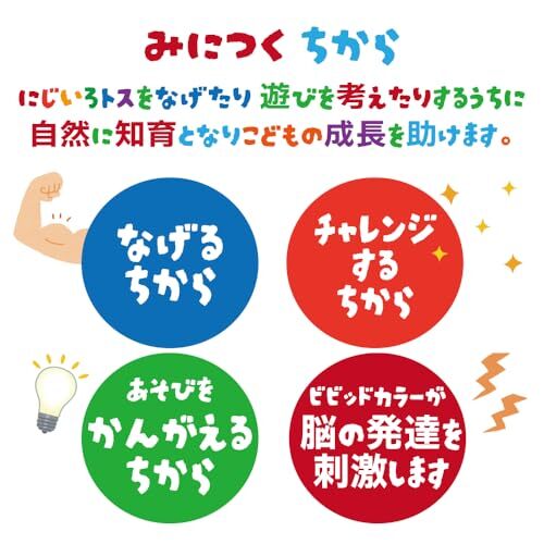 【頭と体の知育に最適】キャッチボールをしたり、お互いに同時に投げ合ってキャッチできるかやってみたり、上に投げてキャッチしたり、ズボンのうしろに差し込んで「しっぽ取り」したり、ぶんぶん回して遠心力を楽しんだり、ぶらぶら揺らして遊んだり・・・投げることで腕の力や「どうやって投げれば遠くまで届くか」考えながらチャレンジすることで、自然に知育になります!!考える力、チャレンジする力、繰り返し努力する力が身に付きます!また、昨今はくすみ系のカラーを取り入れた商品が多いですが、にじいろトスは脳の発達を促す「ビビッドカラー」で作られており、色彩感覚も身に着けることができます。親子で友達同士で楽しく遊べるおもちゃです。
