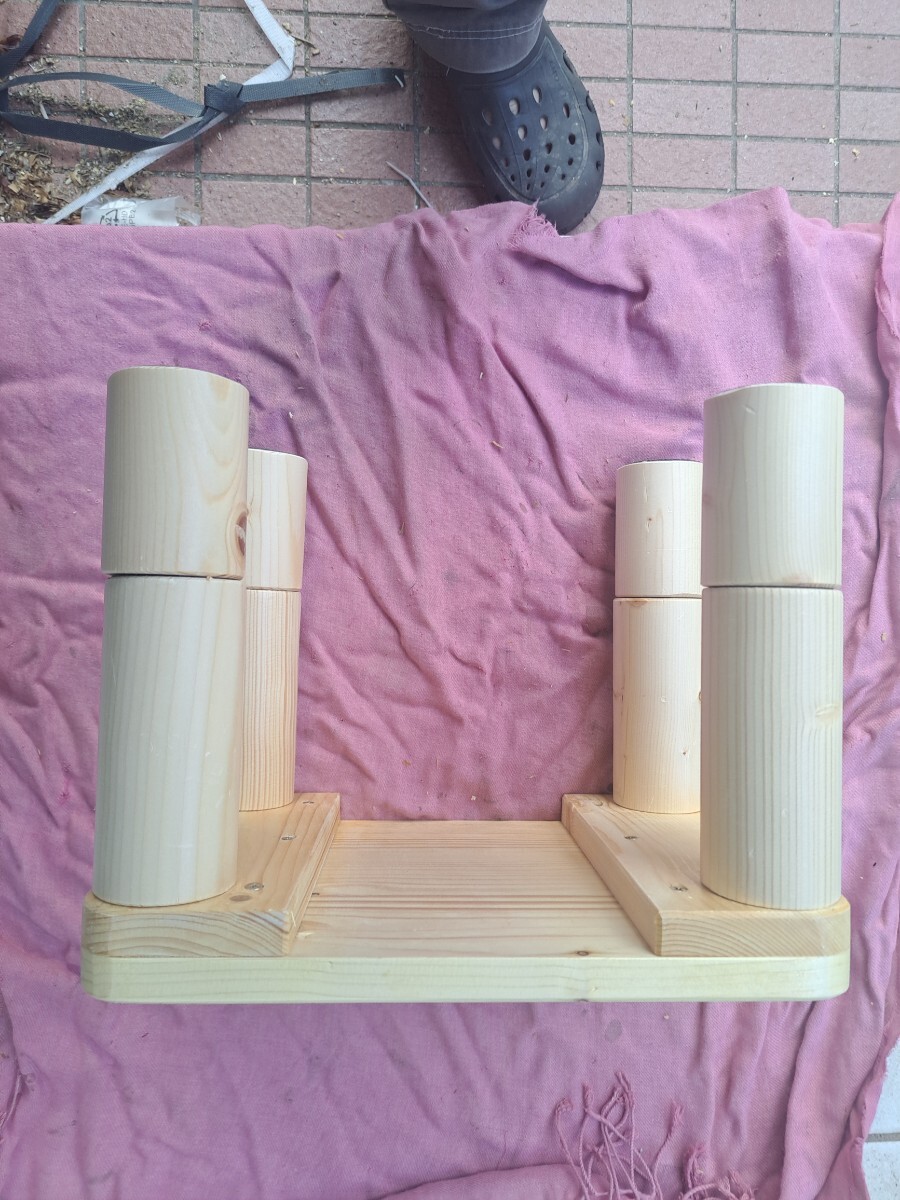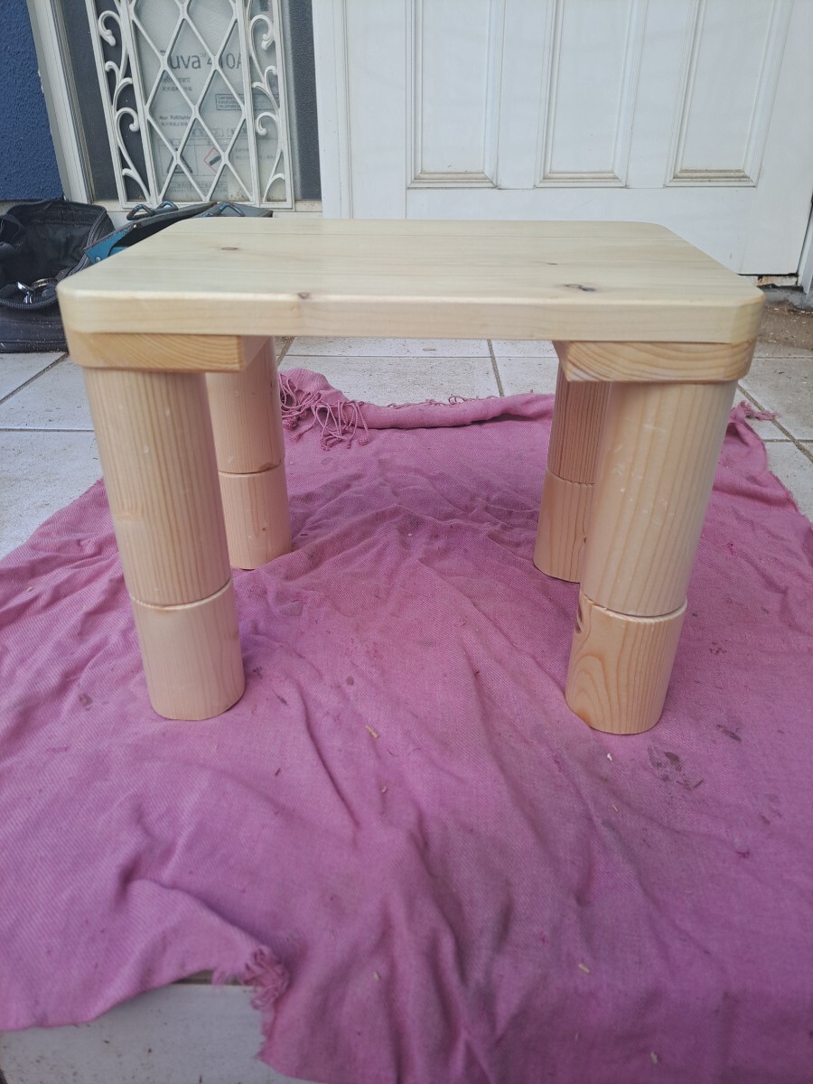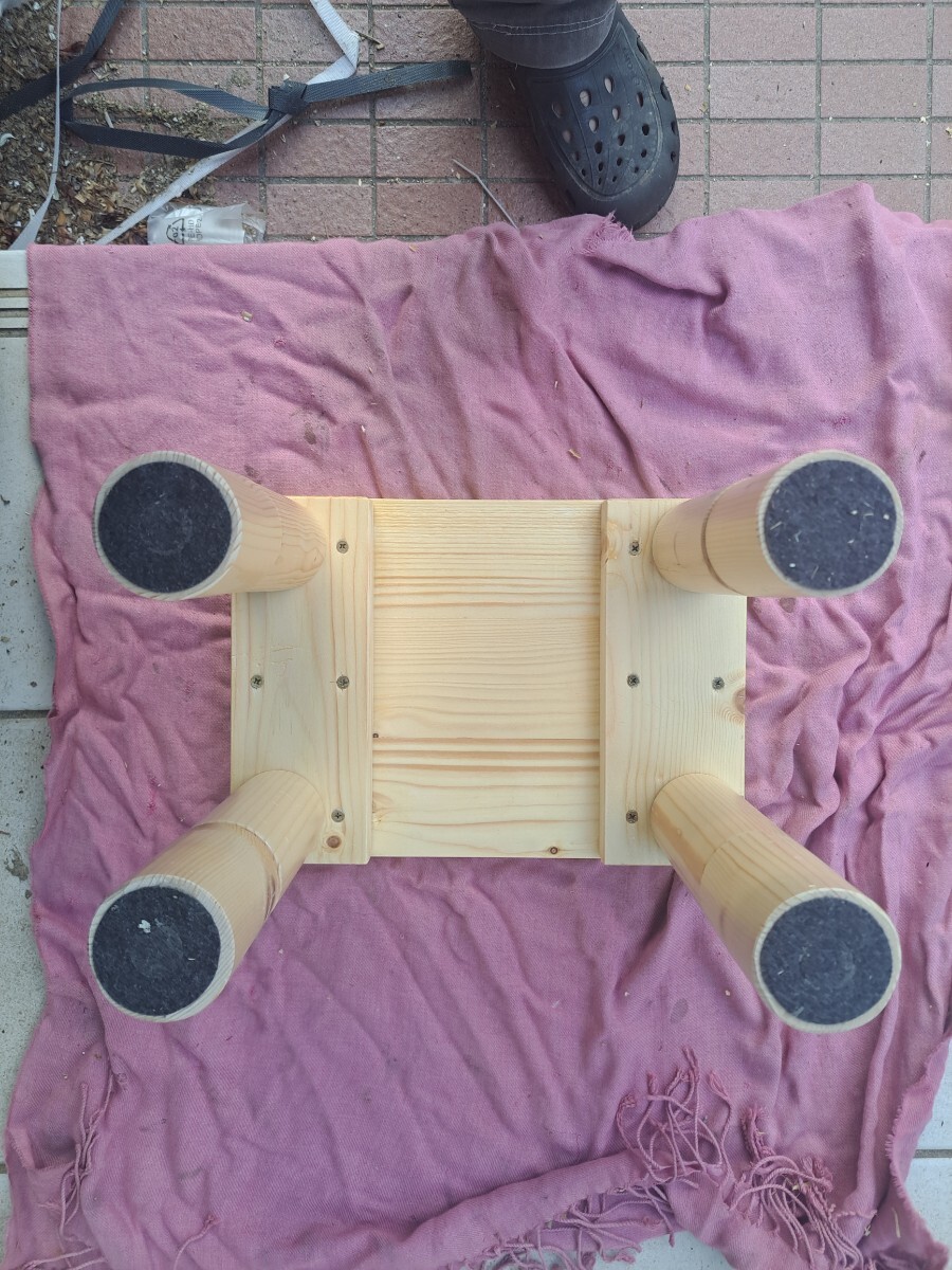 私自身の作業用にと思い製作しましたが、角の丸みと足の丸みのバランスが可愛いく出来上がったので、出品する事にしました。 素材はホワイトウッドで自然素材なので節やシミ・小さな欠け・節のパテ埋め・ひび割れ等あり又素人の趣味の木工なので隙間・継ぎ目段差・磨き不足・傷パテ埋め・塗装へたくそ等あります。 足はホームセンターでB級品として安く売られていたもので、ねじ込み式で芯の精度が悪く継ぎ目に微妙に段差があります。又節及び多少の傷有ります。 ※普通の木材は家具用木材とは違い気温・湿度によりねじれ・歪みが生じます。製作時点でキチンと寸法揃えても日がたつとガタつく事も有るかもしれませんが、その場合足にフェルト等張り付けて対策してください。 仕上げは座面はウレタンの3度塗り仕上げでわりとツルツルしてます。 サイズ的には横32cm奥行22.5m高さは3段階調節で1段の短い場合は12cmで長い場合は17cm2段の場合は25cmとご希望の高さに調整してください。 趣味の手作り品で真心こめて製作しておりますが、家具屋さんで見るような高級家具と比べられては困ります。 発送サイズの関係で足は外して梱包しますので、1段2段ご希望の高さでねじ込んでお使いください。踏み台や椅子やフラワースタンド等ご利用いただけます。