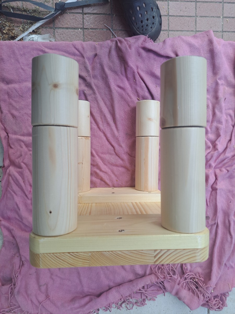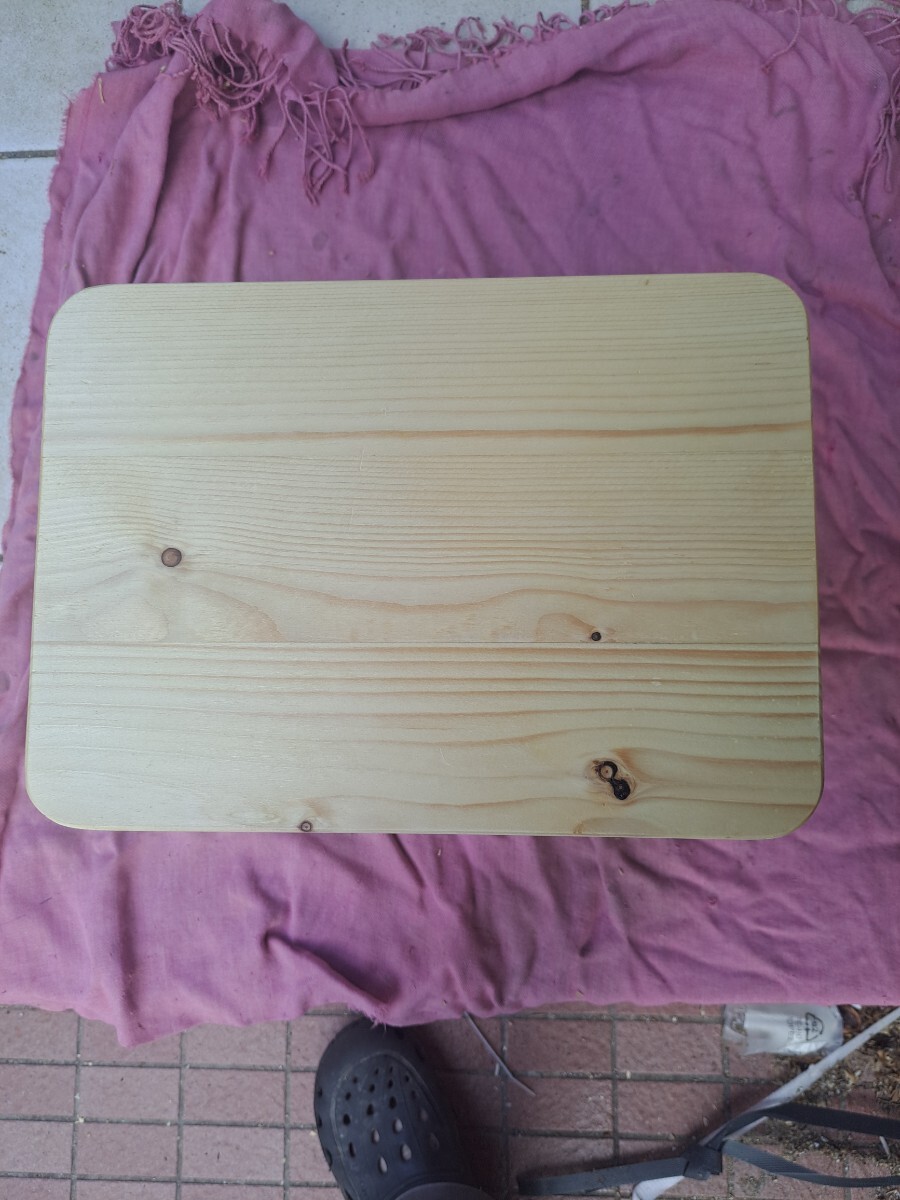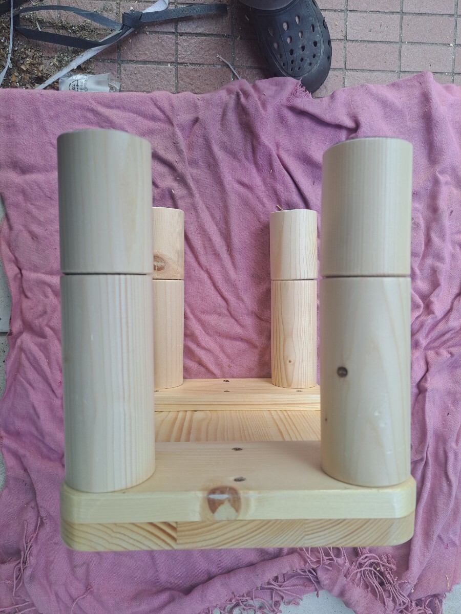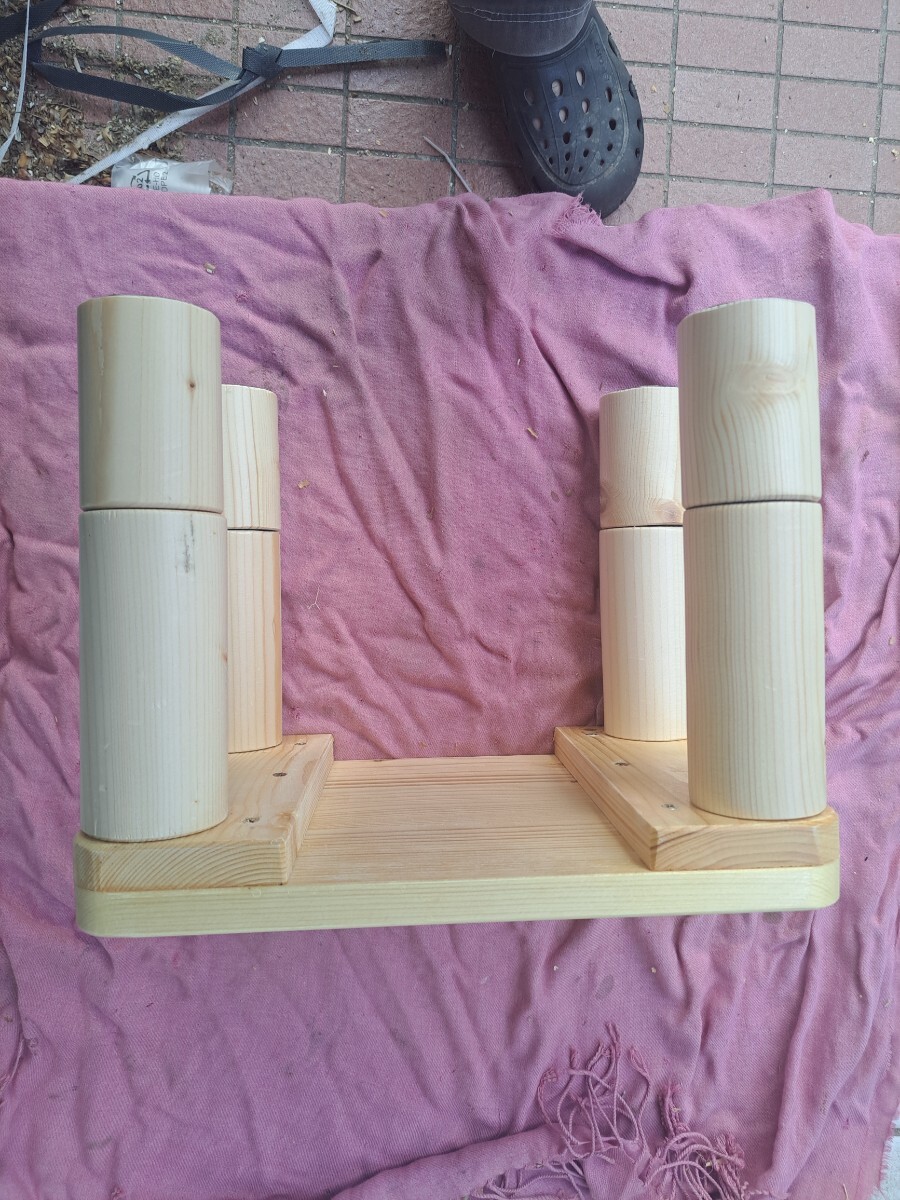 私自身の作業用にと思い製作しましたが、角の丸みと足の丸みのバランスが可愛いく出来上がったので、出品する事にしました。 素材はホワイトウッドで自然素材なので節やシミ・小さな欠け・節のパテ埋め・ひび割れ等あり又素人の趣味の木工なので隙間・継ぎ目段差・磨き不足・傷パテ埋め・塗装へたくそ等あります。 足はホームセンターでB級品として安く売られていたもので、ねじ込み式で芯の精度が悪く継ぎ目に微妙に段差があります。又節及び多少の傷有ります。 ※普通の木材は家具用木材とは違い気温・湿度によりねじれ・歪みが生じます。製作時点でキチンと寸法揃えても日がたつとガタつく事も有るかもしれませんが、その場合足にフェルト等張り付けて対策してください。 仕上げは座面はウレタンの3度塗り仕上げでわりとツルツルしてます。 サイズ的には横32cm奥行22.5m高さは3段階調節で1段の短い場合は12cmで長い場合は17cm2段の場合は25cmとご希望の高さに調整してください。 趣味の手作り品で真心こめて製作しておりますが、家具屋さんで見るような高級家具と比べられては困ります。 発送サイズの関係で足は外して梱包しますので、1段2段ご希望の高さでねじ込んでお使いください。踏み台や椅子やフラワースタンド等ご利用いただけます。