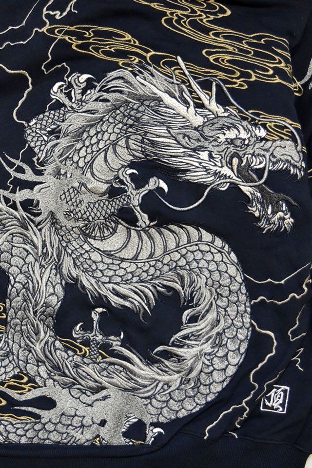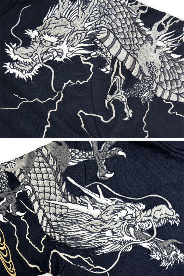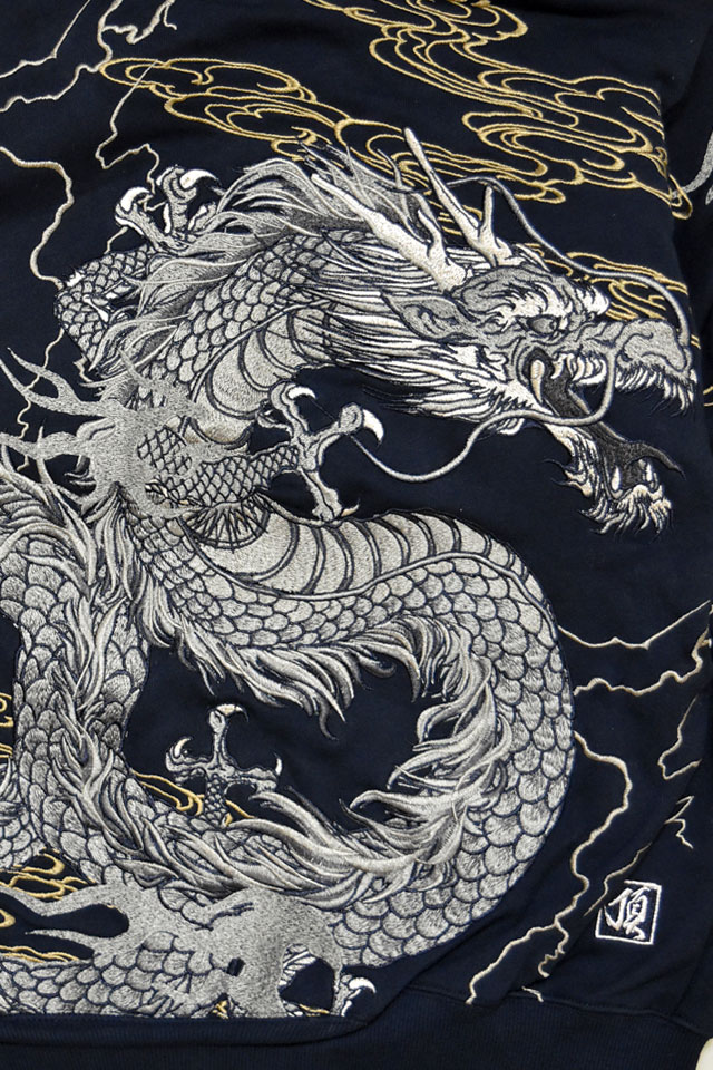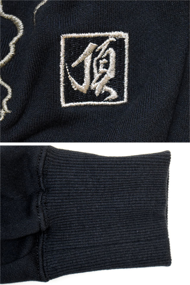 絡繰魂さんから「頂 龍神ノ頂スウェットジップパーカー(253061)」のご紹介です。 重みを感じる程の刺繍量が魅力的な絡繰魂の「頂」シリーズから、長く着まわせるスウェットパーカーが登場しました。 今回モチーフの主役に採用されたのは、迫力満点な龍神。 フロント両肩には、二頭の龍神を対になるような形で配置。 袖には龍の体がぐるぐると巻き付く様子が表現されています。 背中には咆哮する龍神の姿をダイナミックに落とし込みました。 柄は縫い目を跨ぐような形で、身頃から袖へと続いており、実際に着用した際にはより立体感をお楽しみ頂けます。 ボディーはしっかりとした裏毛スウェット生地を採用。 フロントはジップアップ仕様で、両身頃にはポケットが縫いつけられています。 袖口、裾にはリブを配し、野暮ったさを軽減しました。 | |||||||||||||||||||||||||